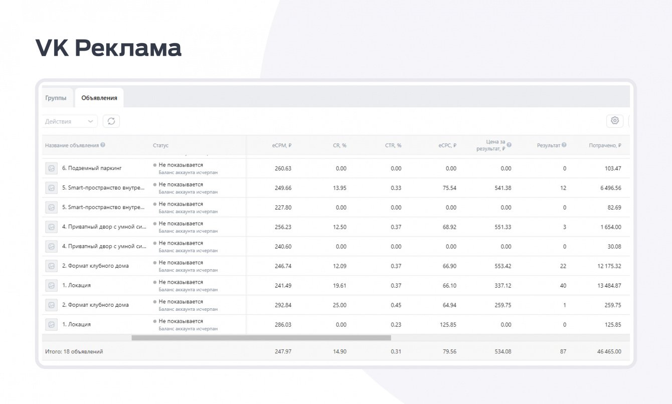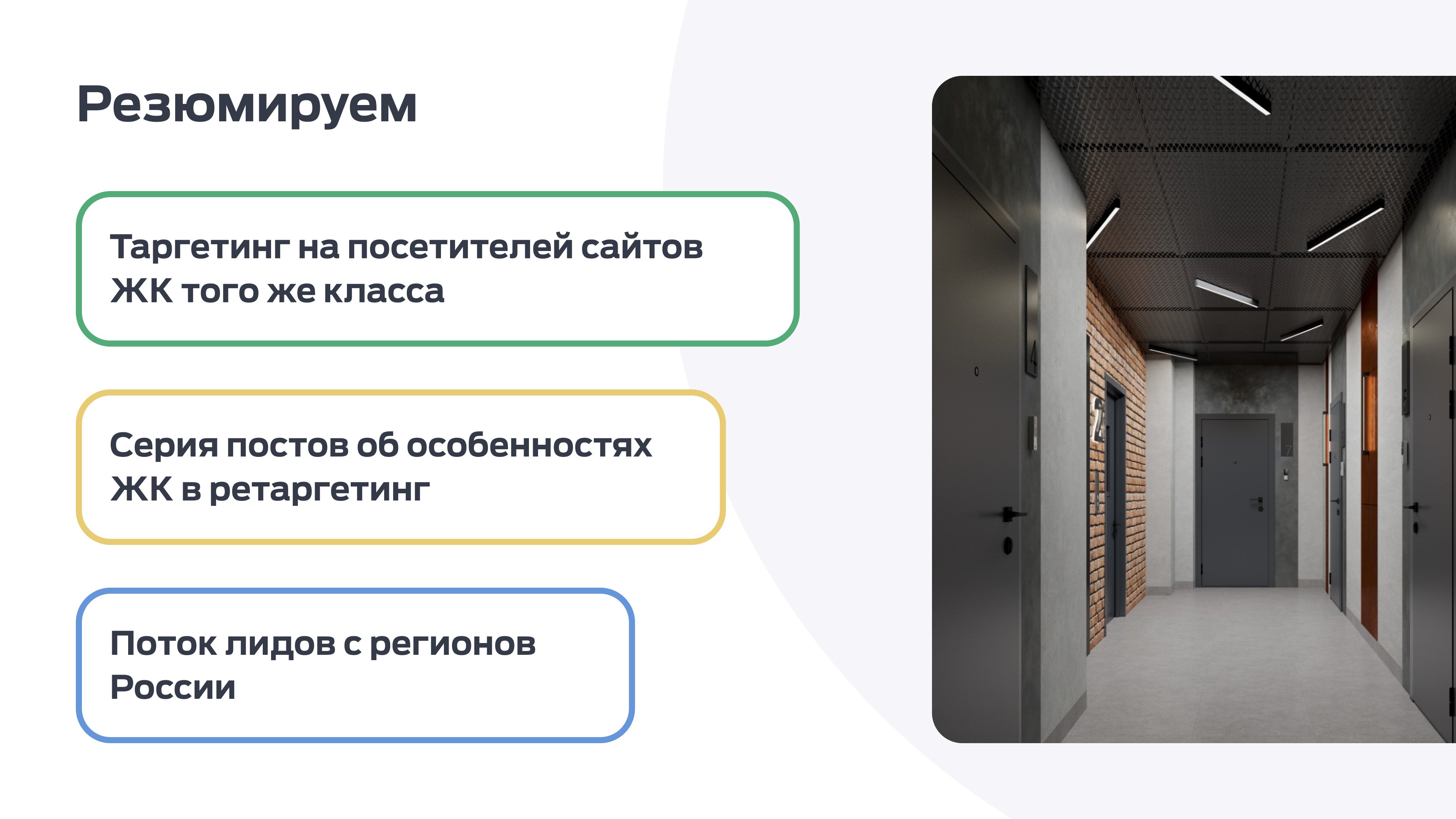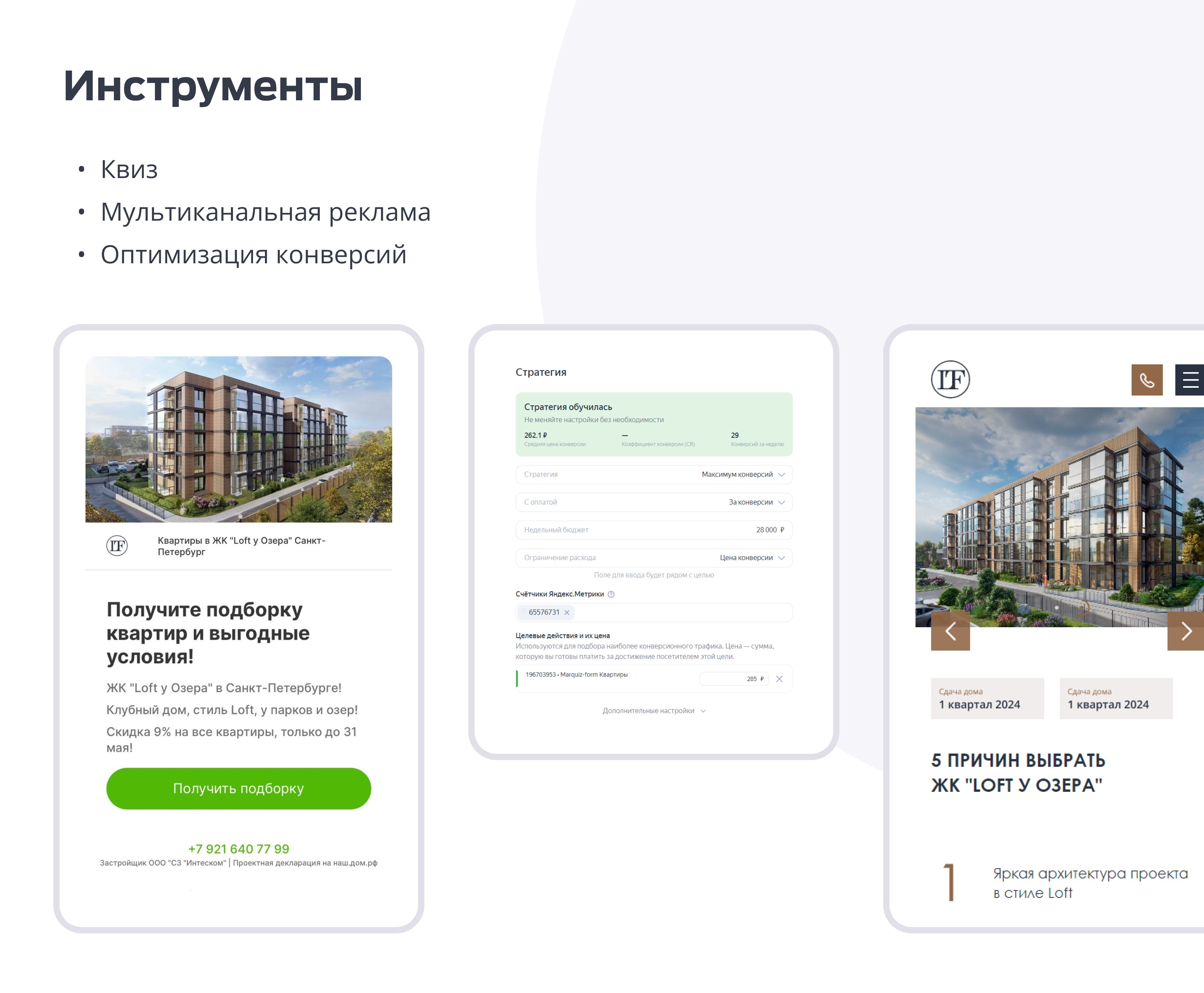 Учитывая специфику ЖК — клубный формат в стиле Loft, наша задача найти целевую аудиторию, кому такой формат подходит. Для увеличения потока лидов, задействовать все регионы России. Рассказать об особенностях и преимуществах объекта.