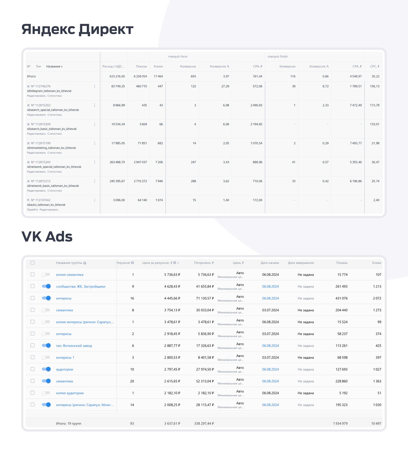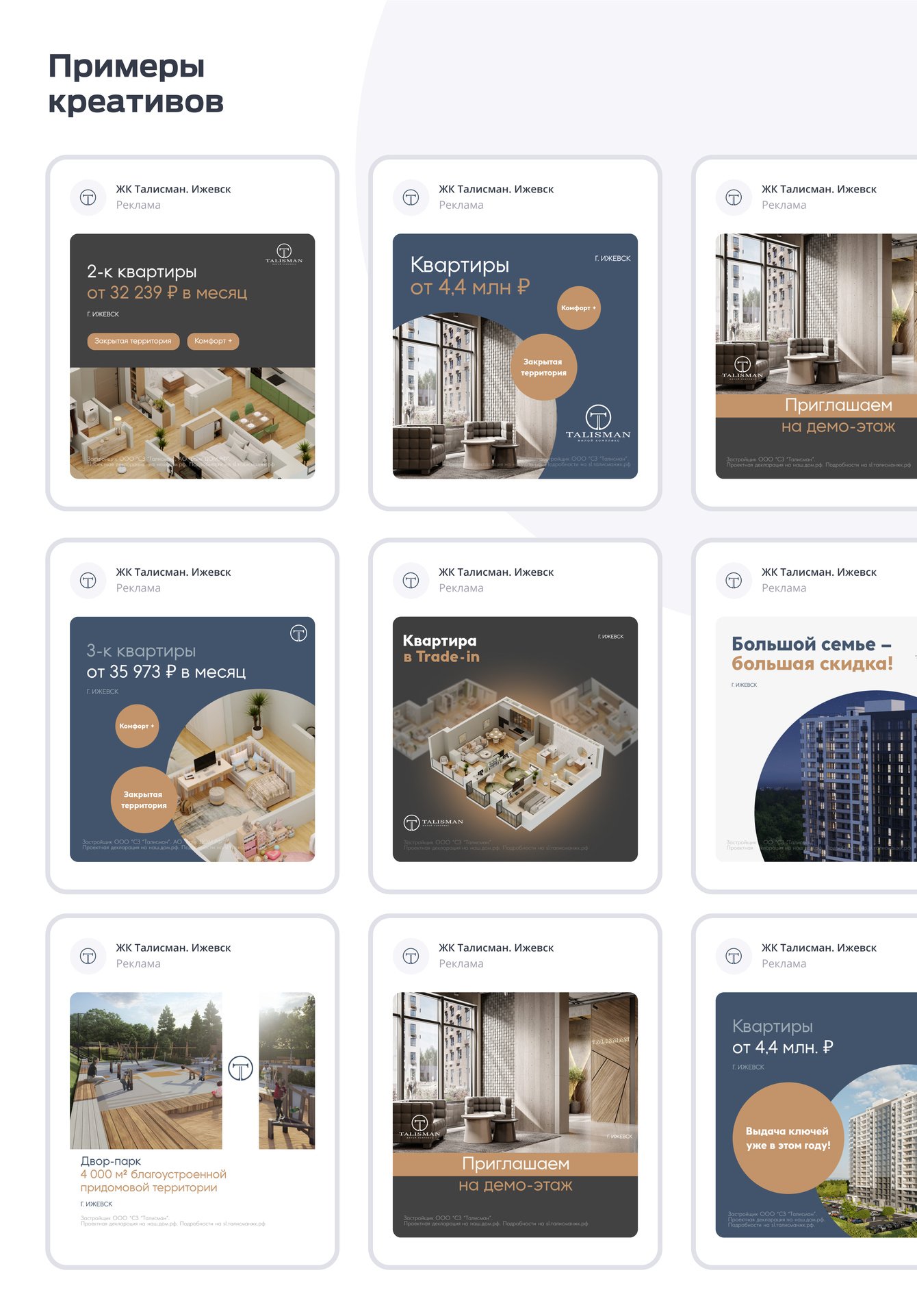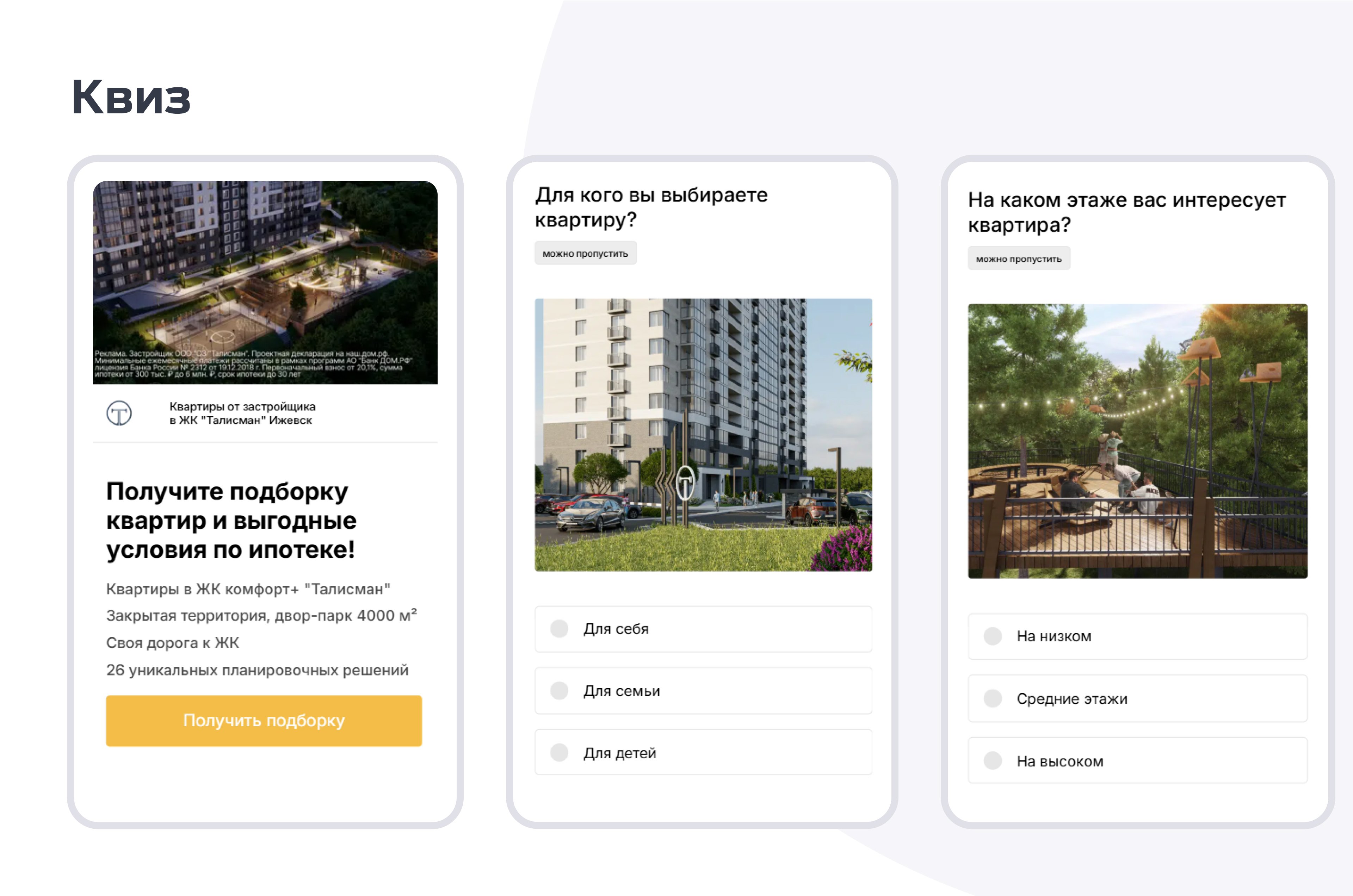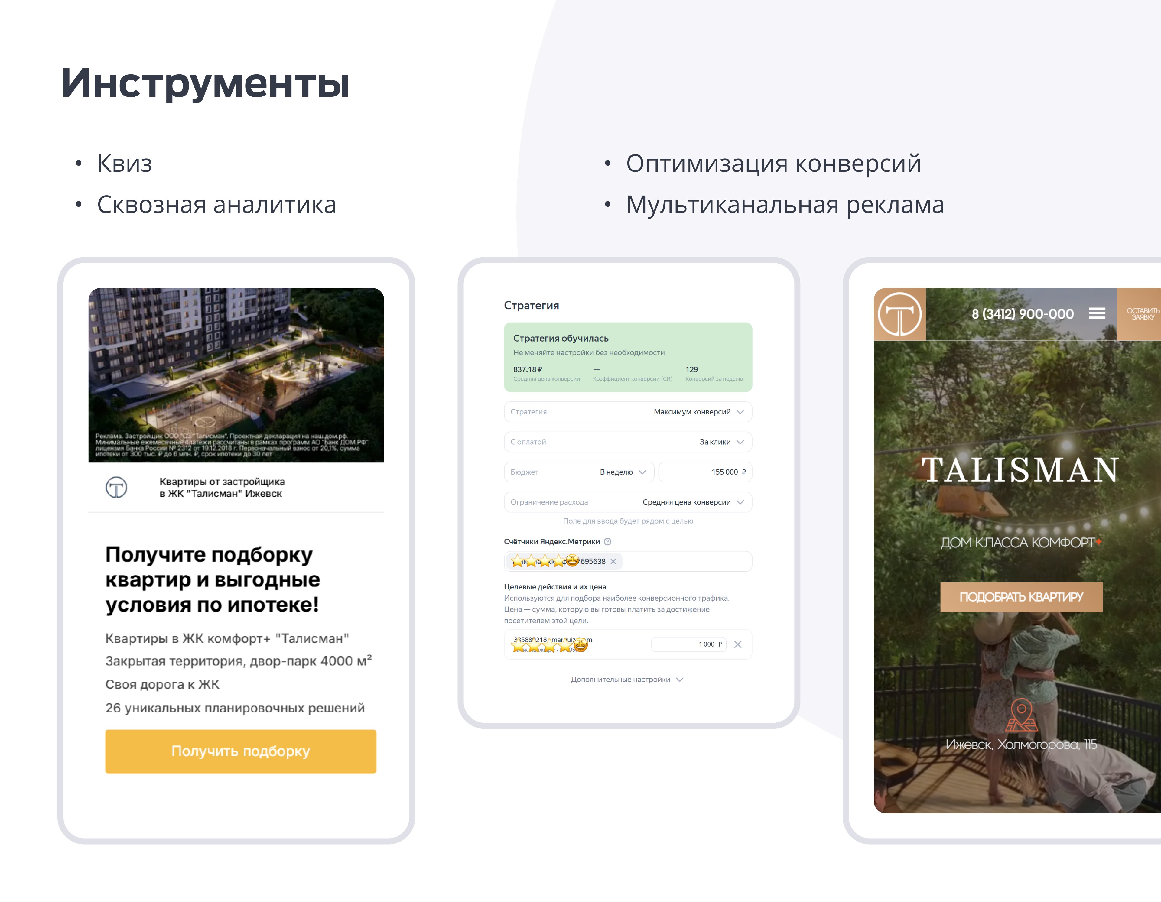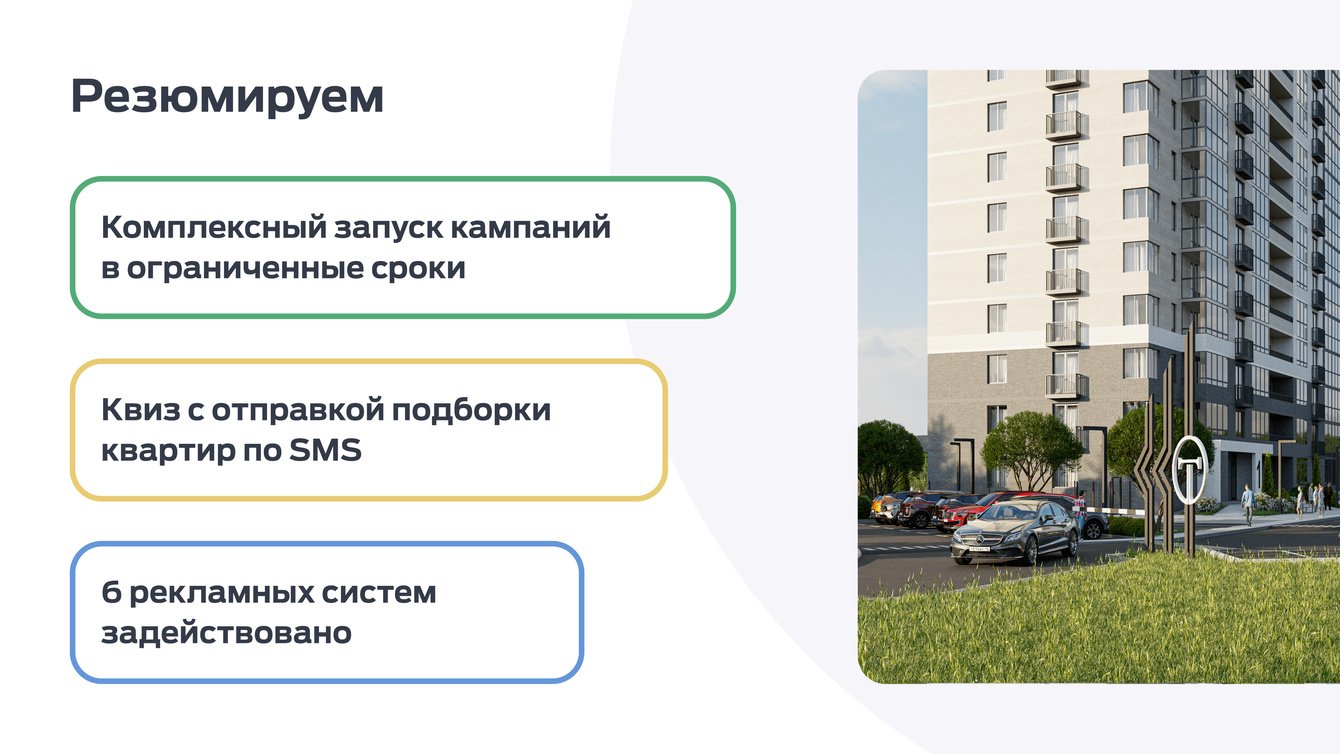 Организовать комплексный запуск рекламных кампаний в ограниченные сроки. Разработать рекламные материалы, квиз с отправкой подборки квартир по SMS. Обеспечить мультиканальное продвижение. KPI — целевые лиды.