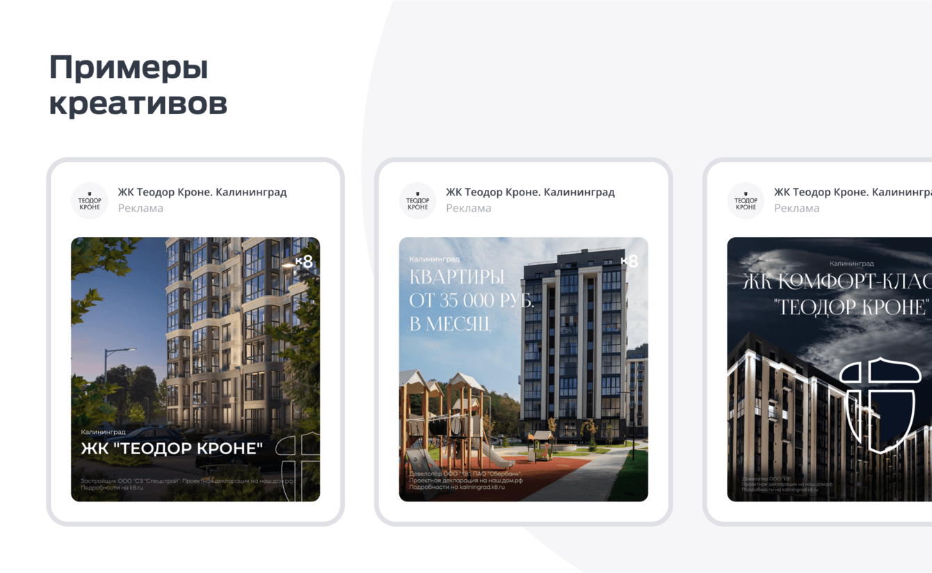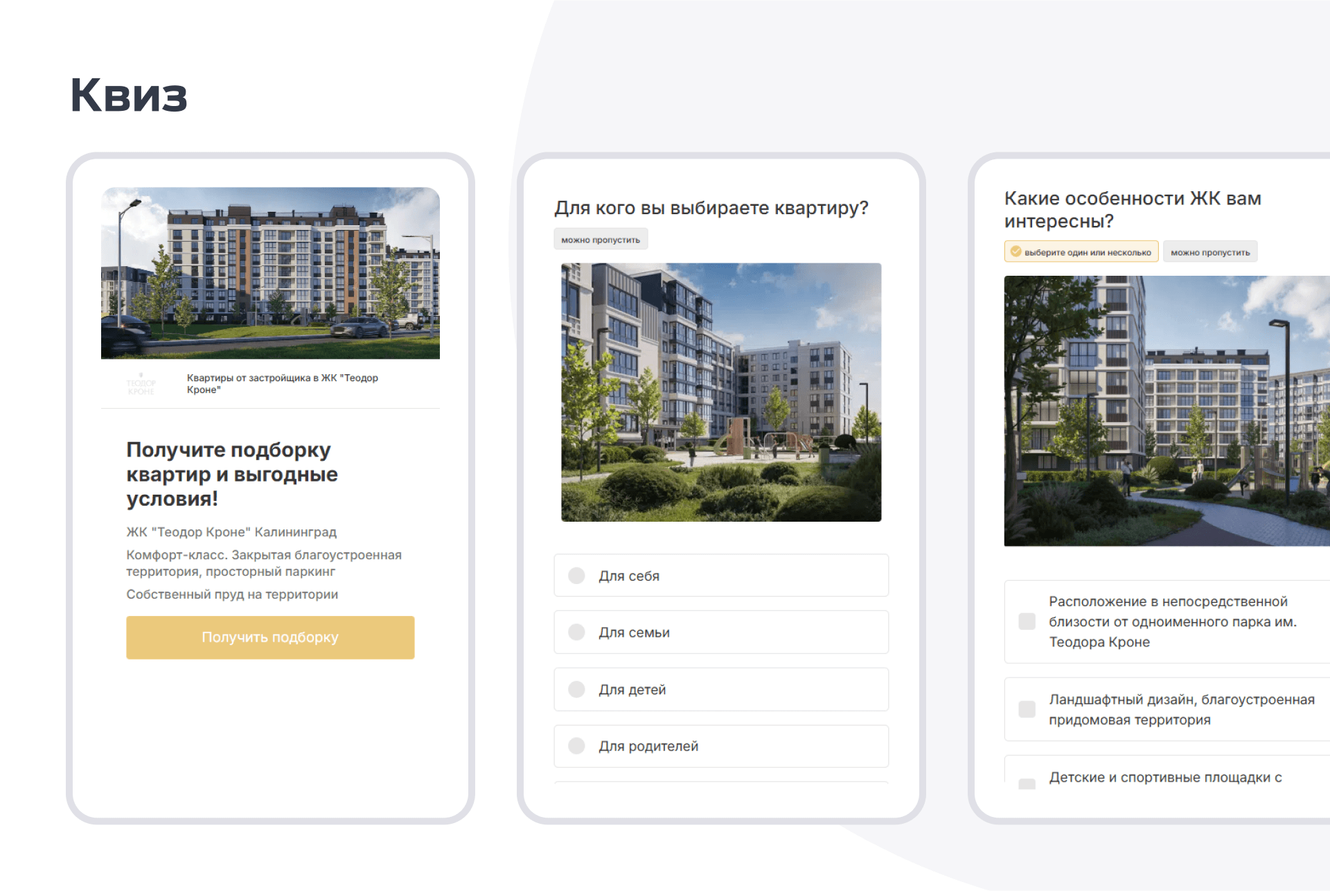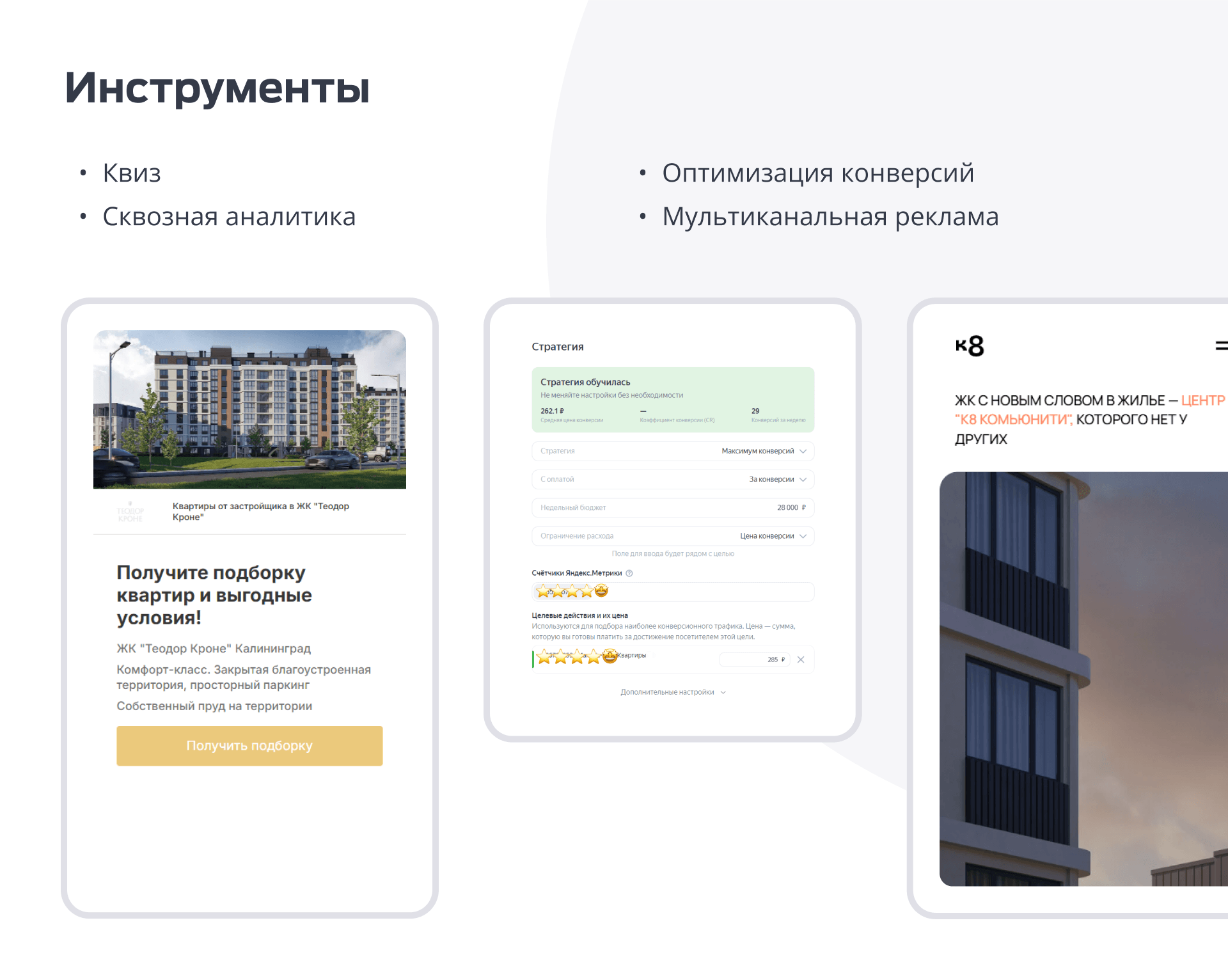 Комфорт-класс в центральном районе Калининграда. Квиз с отправкой подборки квартир по SMS. Таргетированные рассылки по посетителям сайтов аналогичных объектов. Нативные интеграции в Telegram в тематических каналах.