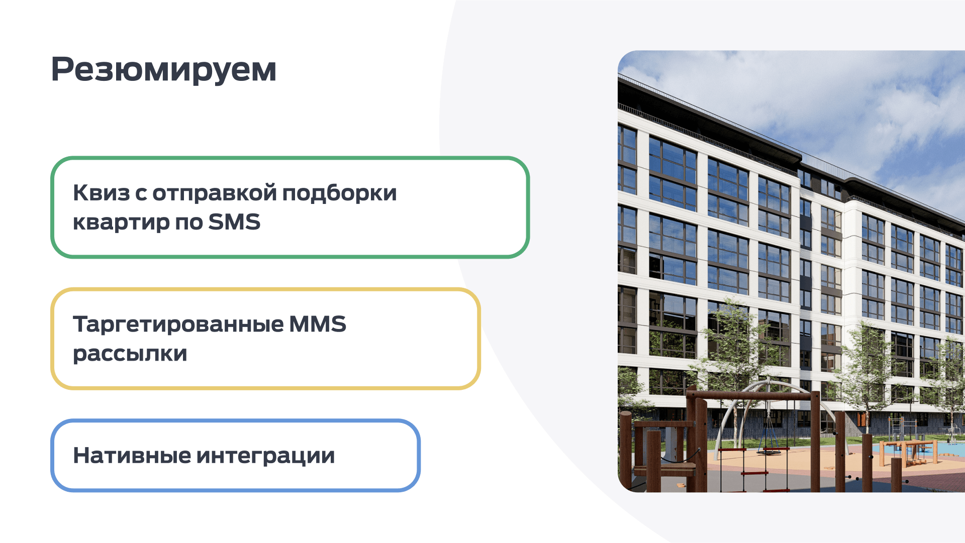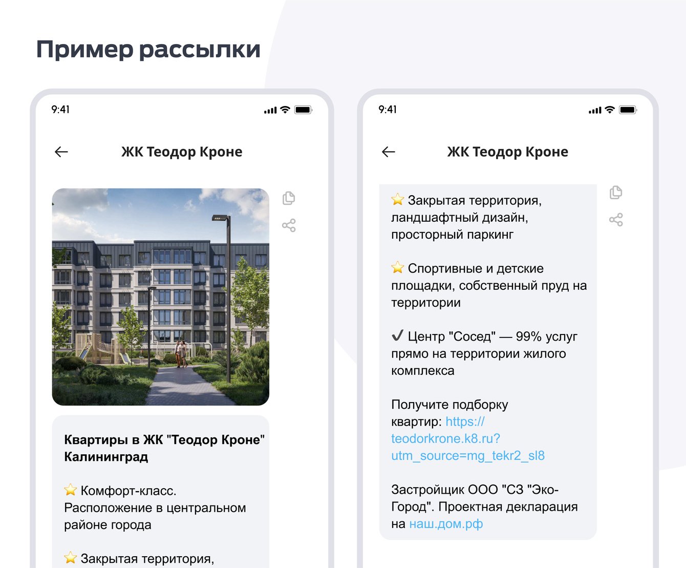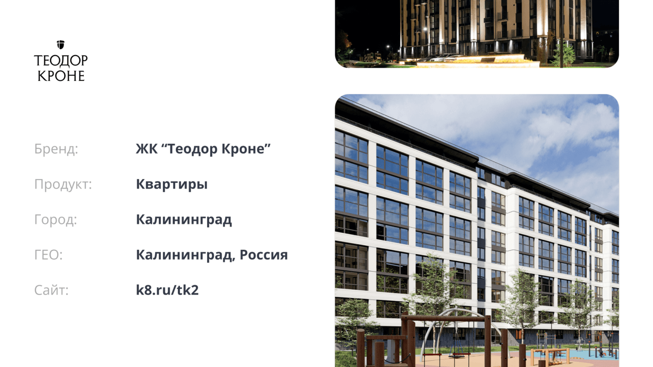 Комфорт-класс в центральном районе Калининграда. Квиз с отправкой подборки квартир по SMS. Таргетированные рассылки по посетителям сайтов аналогичных объектов. Нативные интеграции в Telegram в тематических каналах.