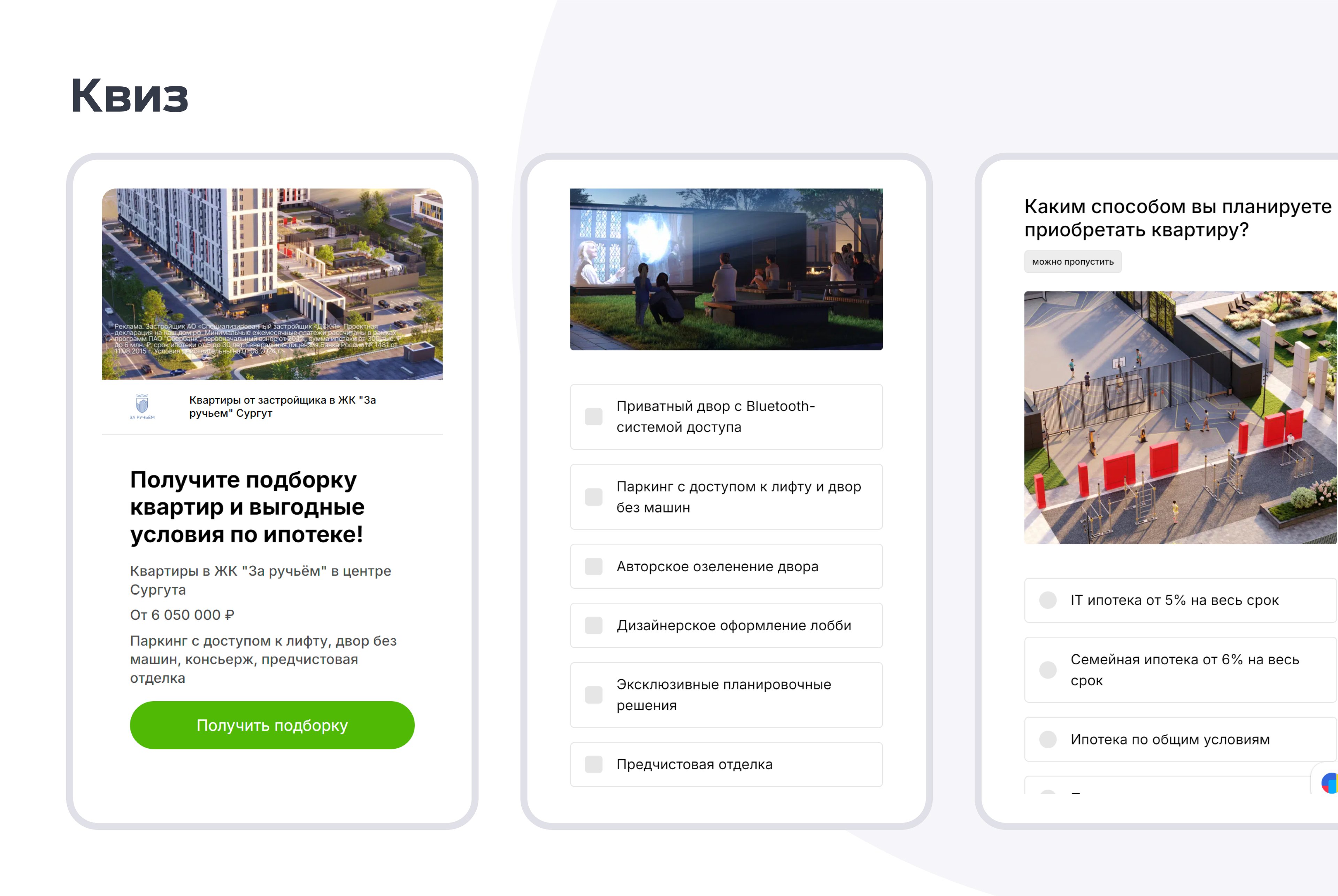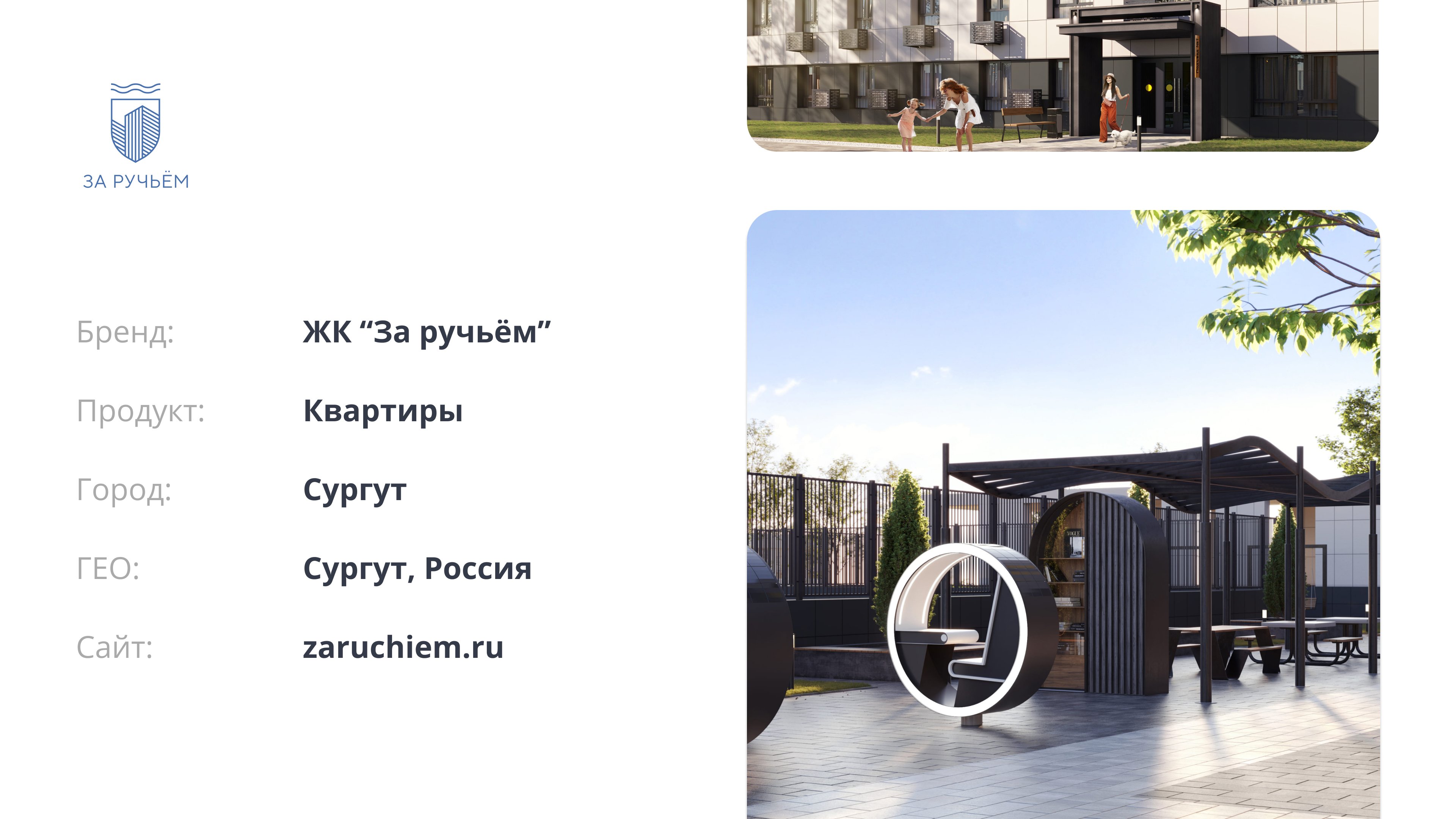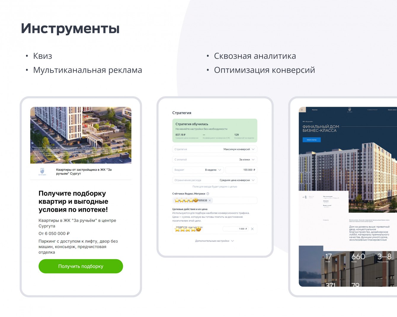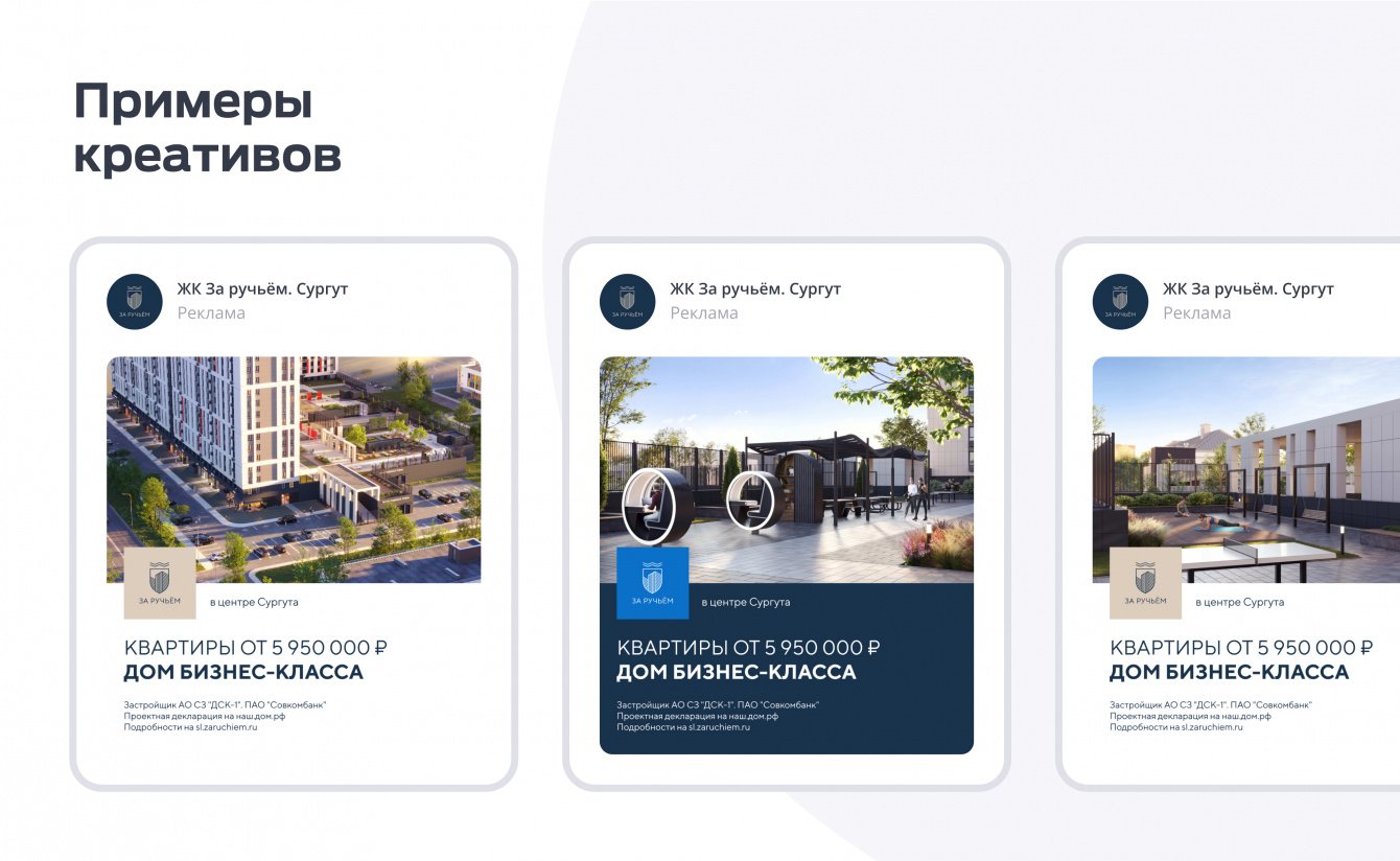 Продвижение дома бизнесс-класса в комплексной застройке ЖК "За ручьём" в Сургуте. Мультиканальный подход в лидогенерации. Проведение медийных кампаний. Разработка квиза и креативов. Оплата за KPI — целевые лиды.