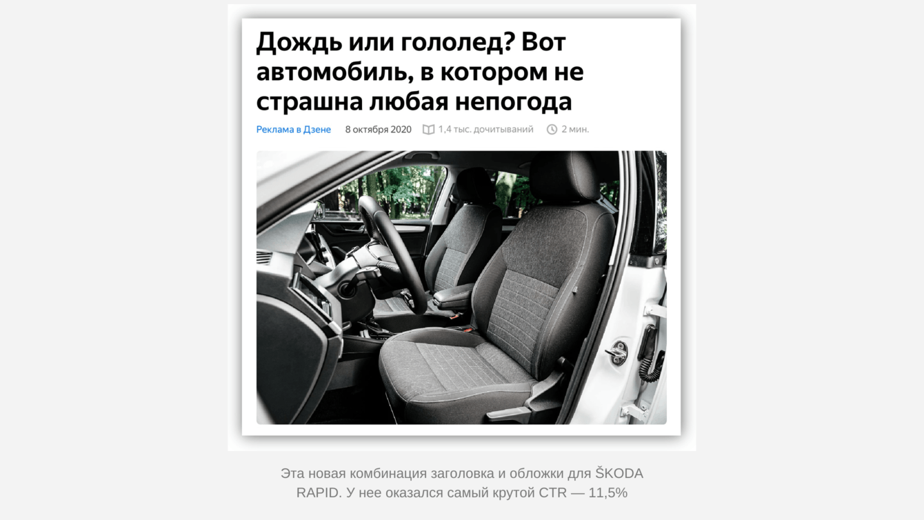 ŠKODA несколько лет издает журнал о своих автомобилях. В качестве теста мы взяли оттуда 4 статьи и адаптировали их под формат Дзена. В них мы не прогревали читателей для покупки авто, а делились занятными фактами из 120-летней истории бренда, показывали много красивых фотографий и отвечали на вопросы водителей. По статистике, такие форматы статей неплохо работают в охватных кампаниях.