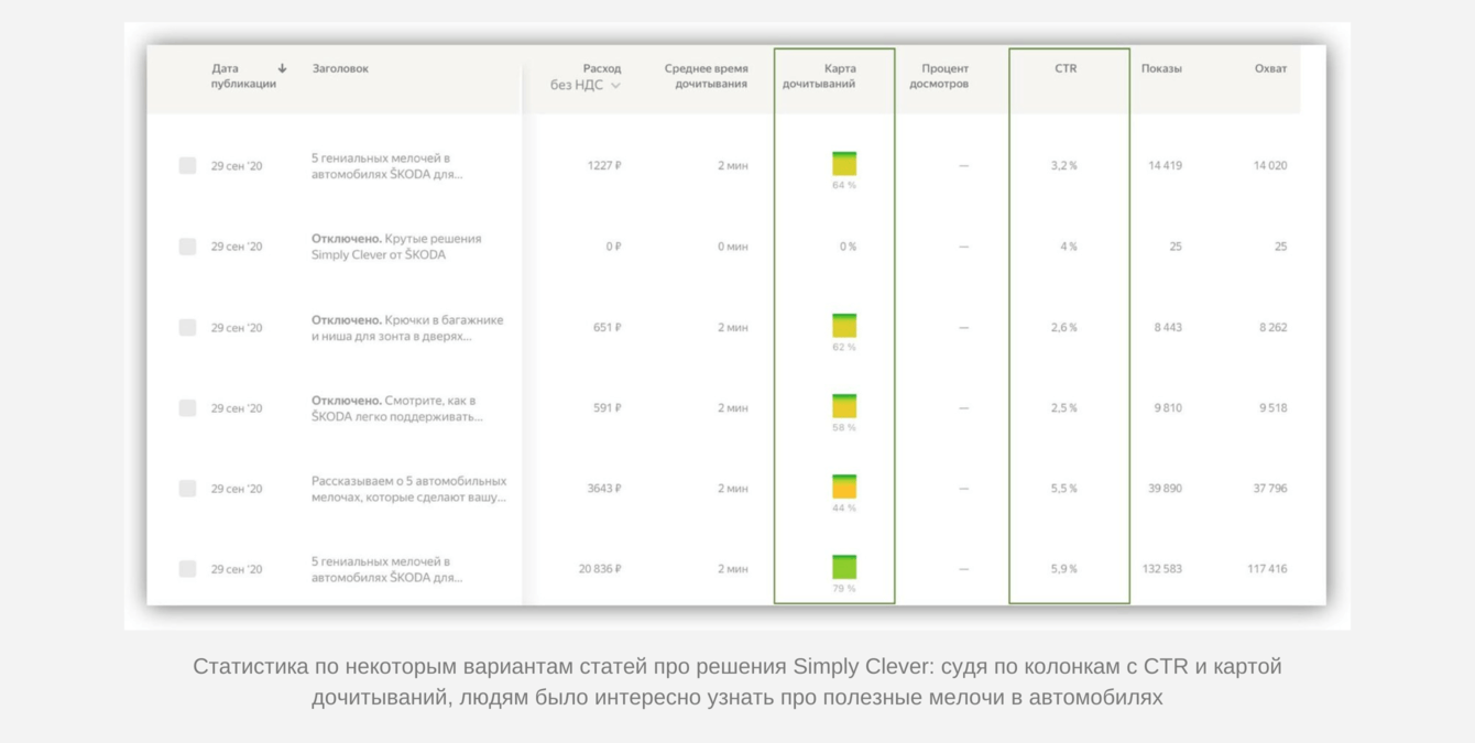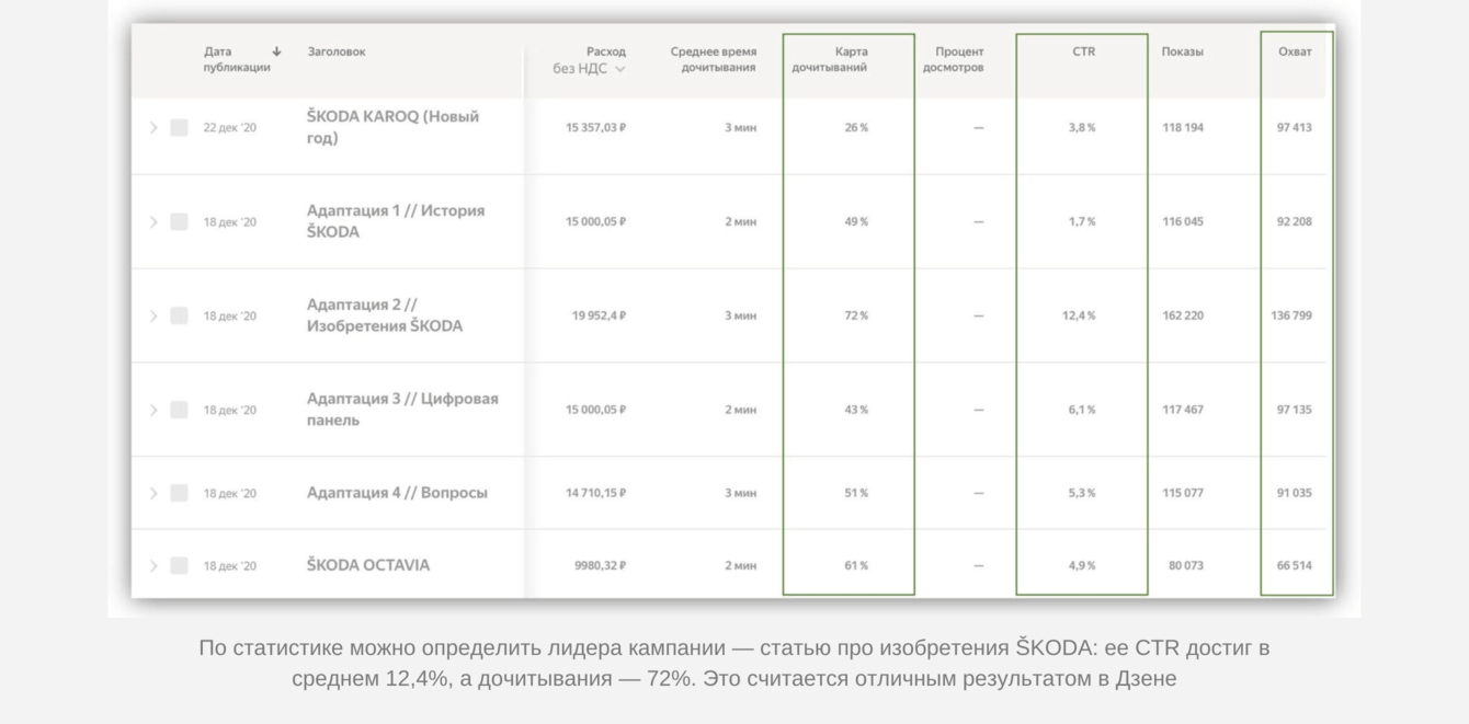 Всего в 9 кампаниях статьи дочитали 72 461 человек, из них на сайт ŠKODA перешли 28 600 человек — это 42,8% переходов. При том, что в Дзене хорошим результатом считается 20% внешних переходов.