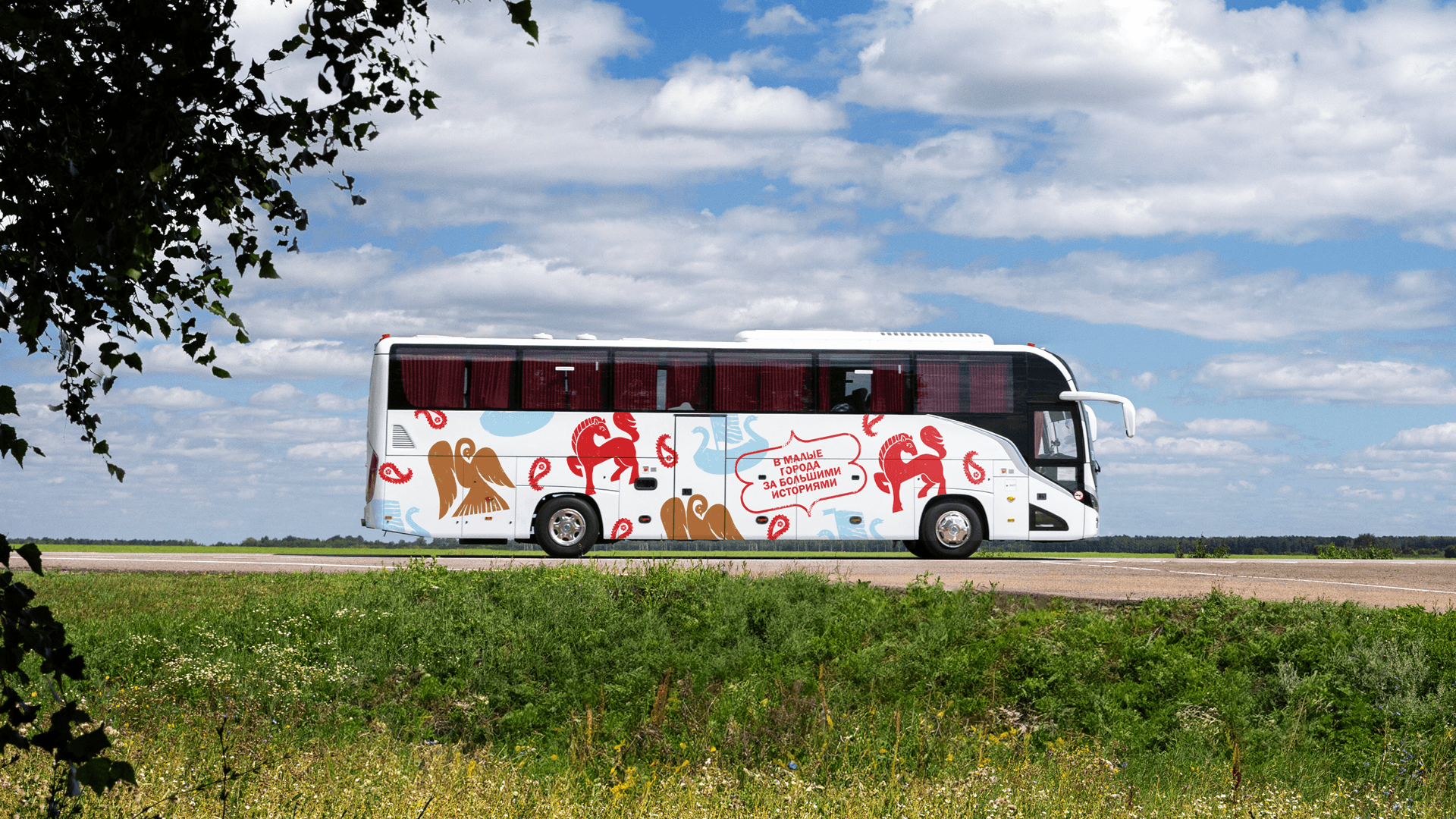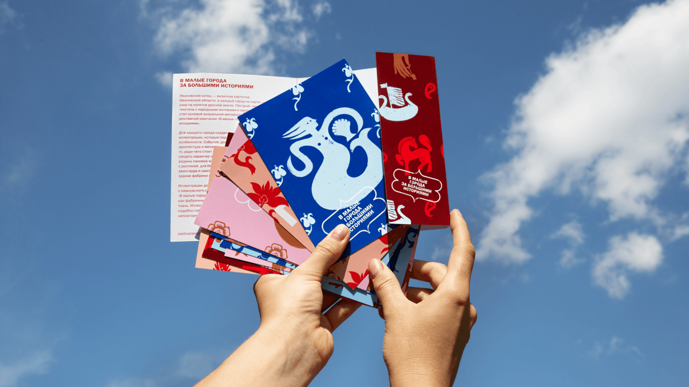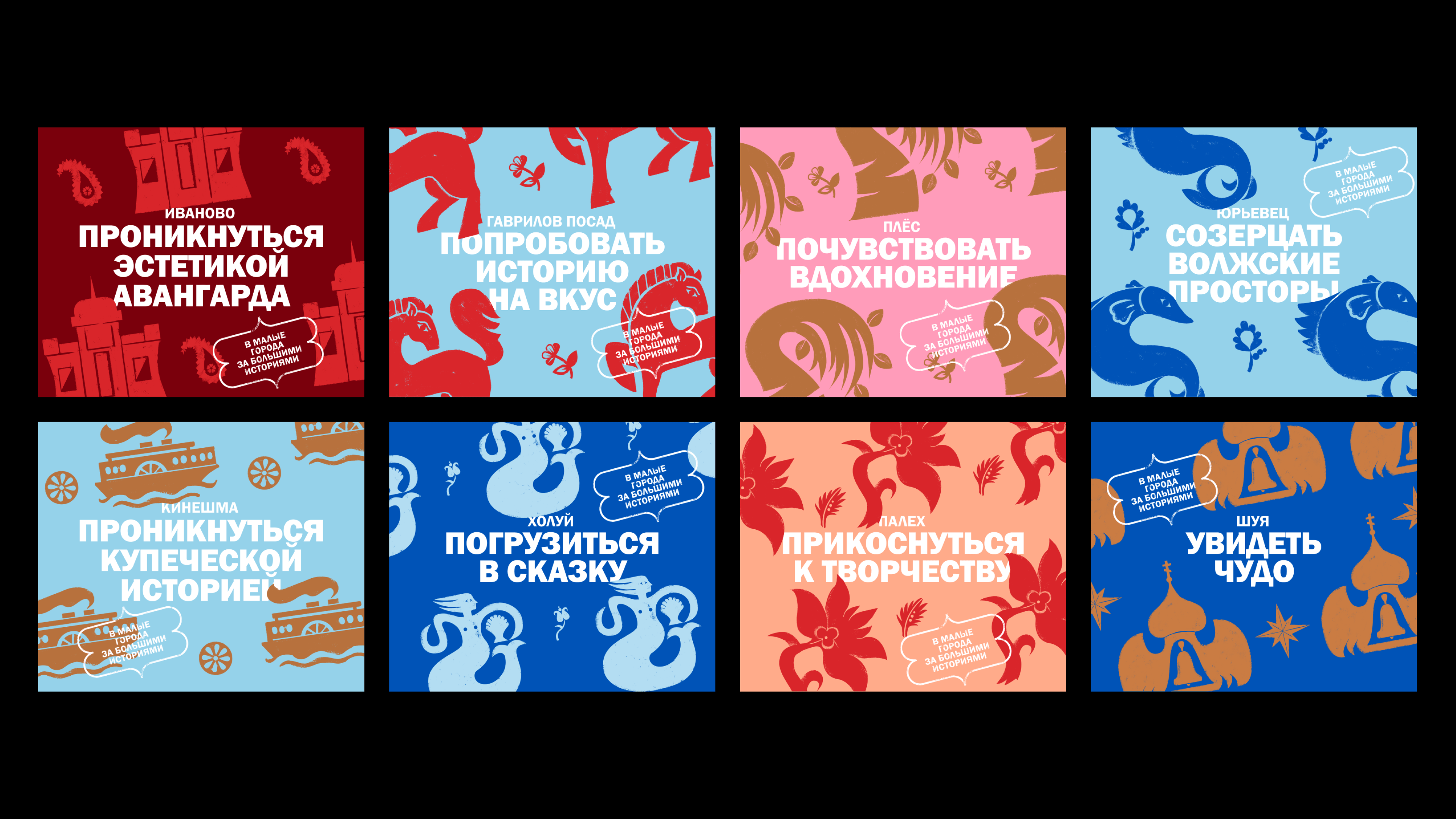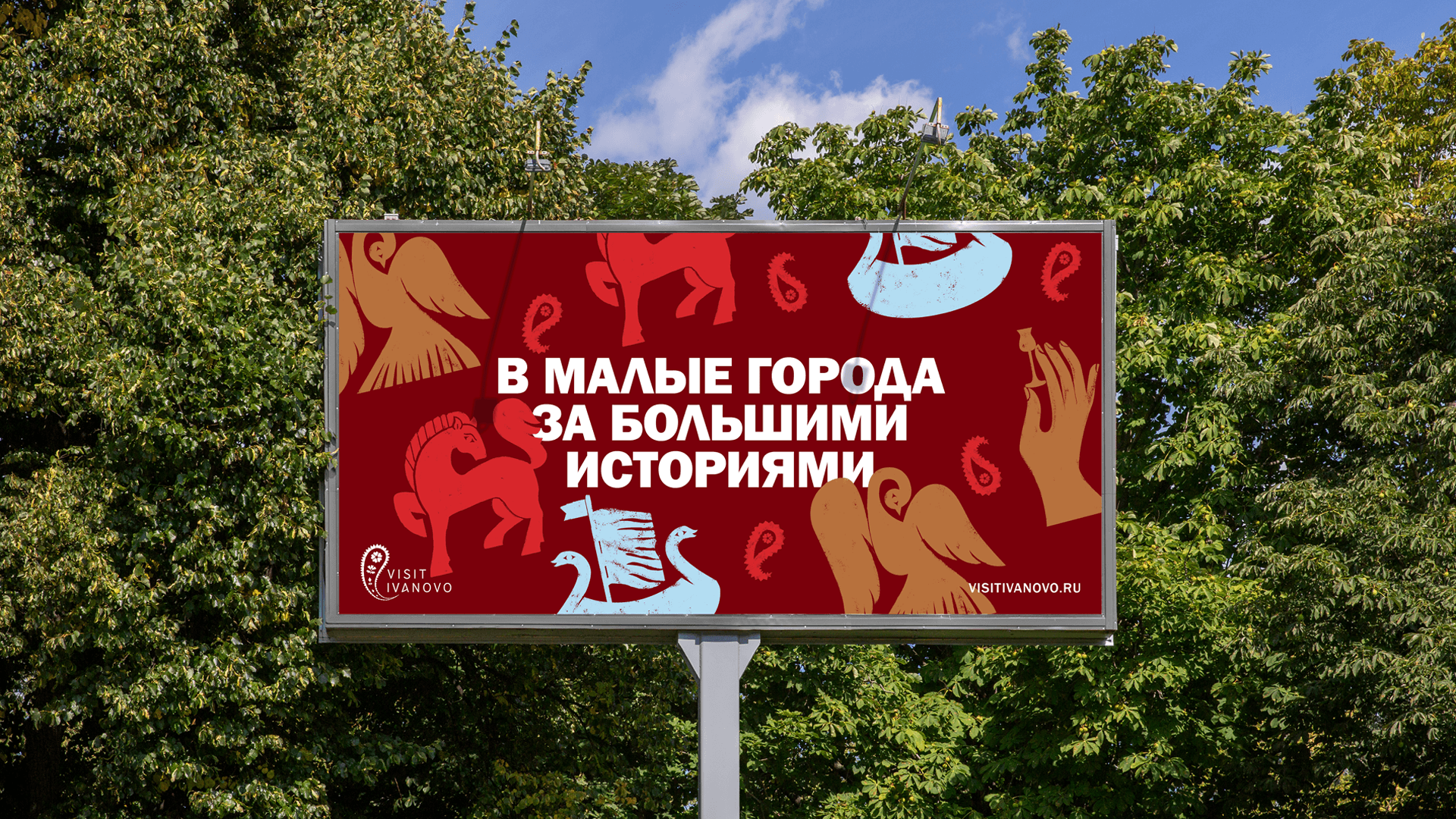 Мы разработали позиционирование, слоган и айдентику рекламной кампании. Ивановский ситец — визитная карточка Ивановской области, а каждый город на карте — узор на полотне русской земли. Пёстрый, нарядный текстиль с народными мотивами и орнаментами стал основой визуальной метафоры туристической рекламной кампании «В малые города за большими историями».