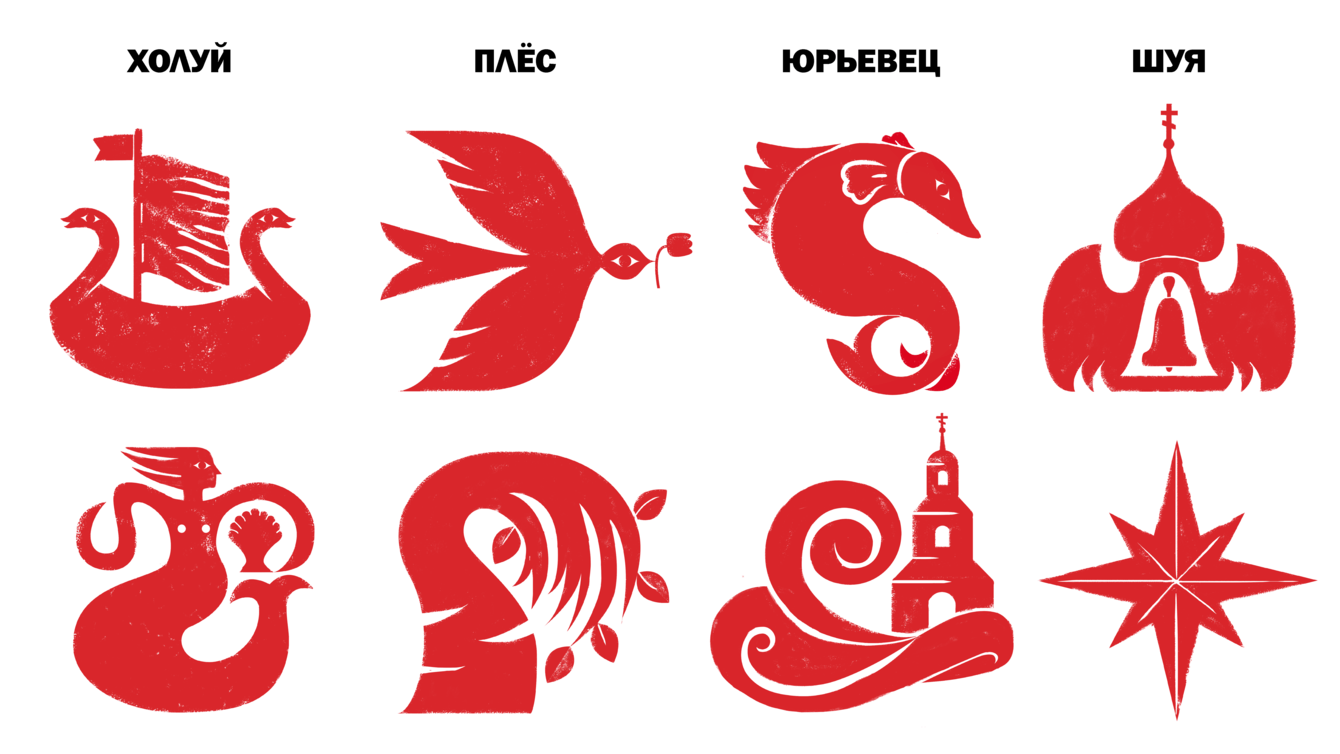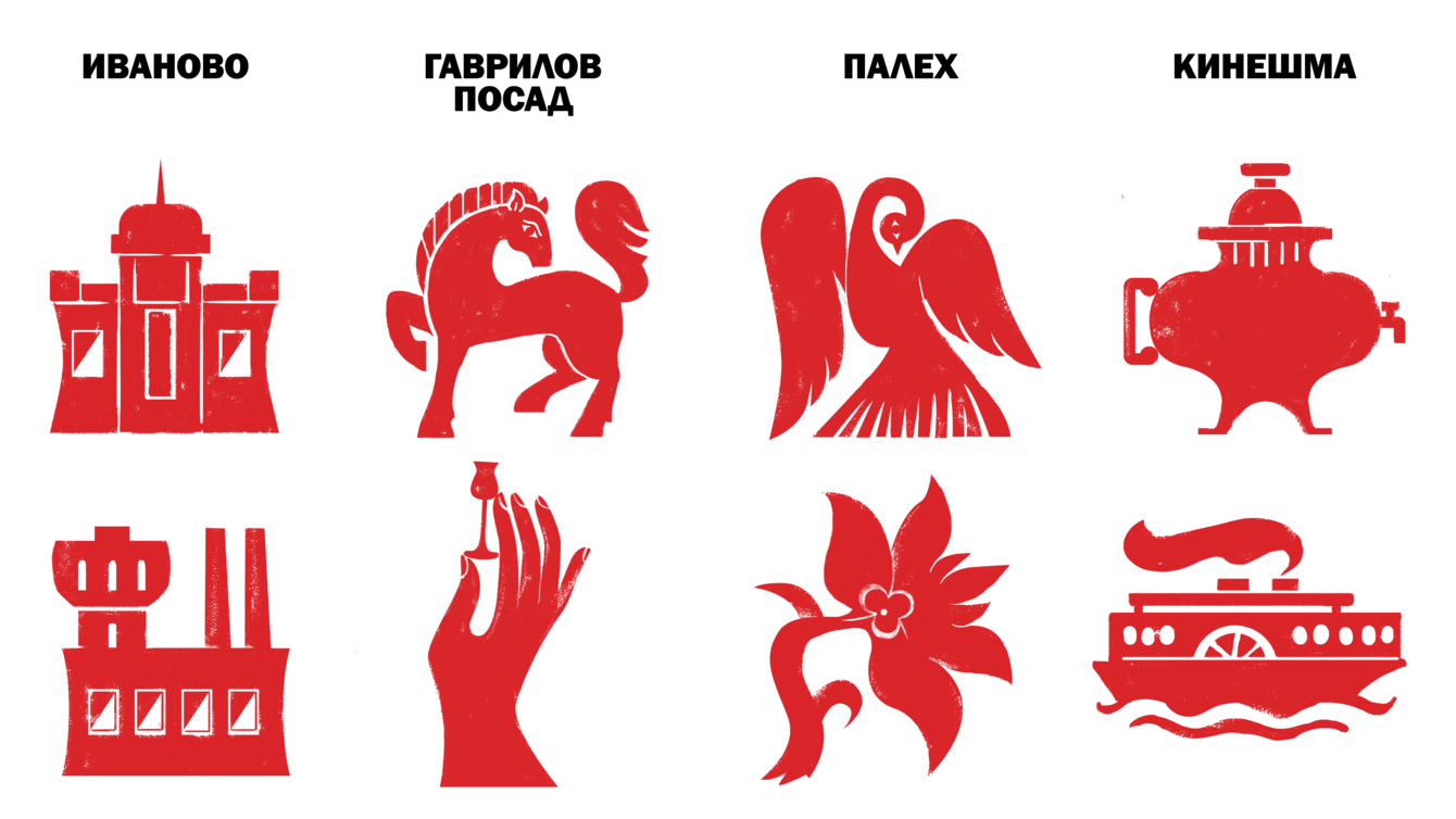 Для каждого города созданы уникальные иллюстрации, которые подчеркивают его особенности. Для Палеха — родины лаковой миниатюры — жар-птица и дерево c росписей, для Иваново — города русского авангарда и швейных мануфактур — Дом-птица, здание фабрики и ивановский огурец.