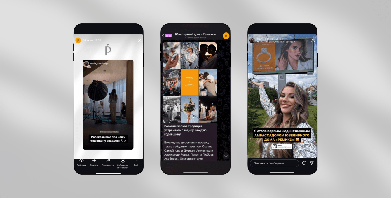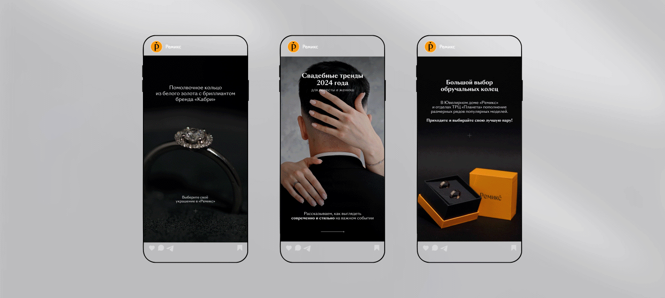 Сначала мы запустили серию прогревающих сторис — про выбор колец к предстоящей свадьбе. Показывали, как проходит процесс, делали акценты на деталях и эмоциях.