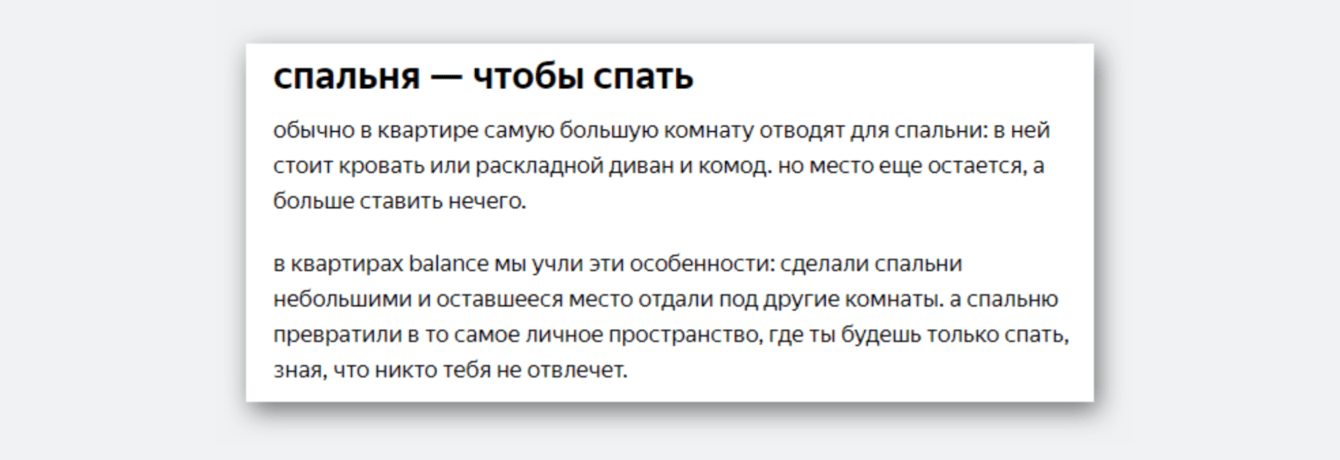 ➔ Не пишите о прикольных штуках только потому, что они прикольные. Квартира — самая дорогая покупка в жизни, и люди редко готовы выложить 10 млн рублей за NFC-замки или французские балконы. Упомяните о необычных плюсах — они привлекут внимание, но не смещайте акцент с действительно важного. Ведь читатели будут много лет расплачиваться за то, о чем вы говорите в статье.