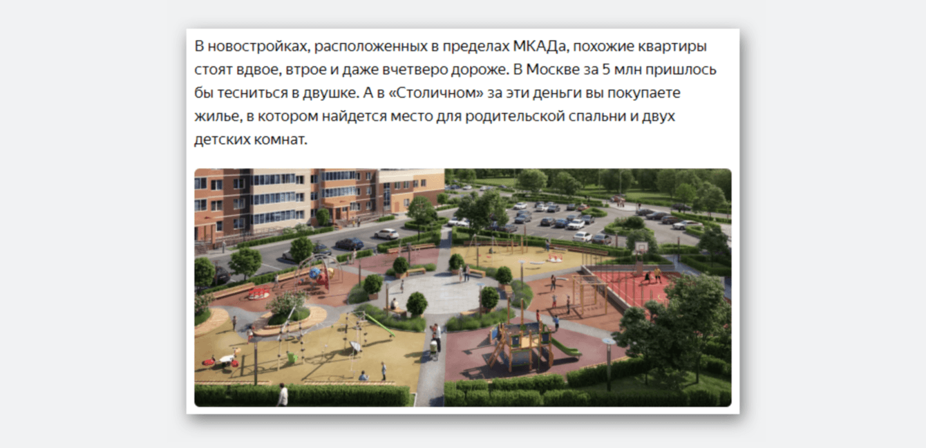 ➔ Не старайтесь сократить статью любой ценой. Обе эффективные публикации — объемные, причем в основном за счет рендеров, фотографий и схем планировок. И все же эти статьи прочитали до конца 46% кликнувших. Читатели потратили в среднем три минуты своего времени на рекламную статью, потому что она попала точно в их потребности. Пишите и показывайте столько, сколько нужно для раскрытия темы материала.