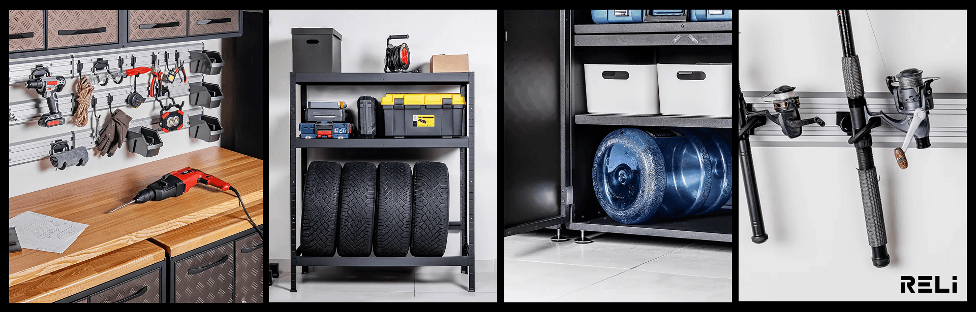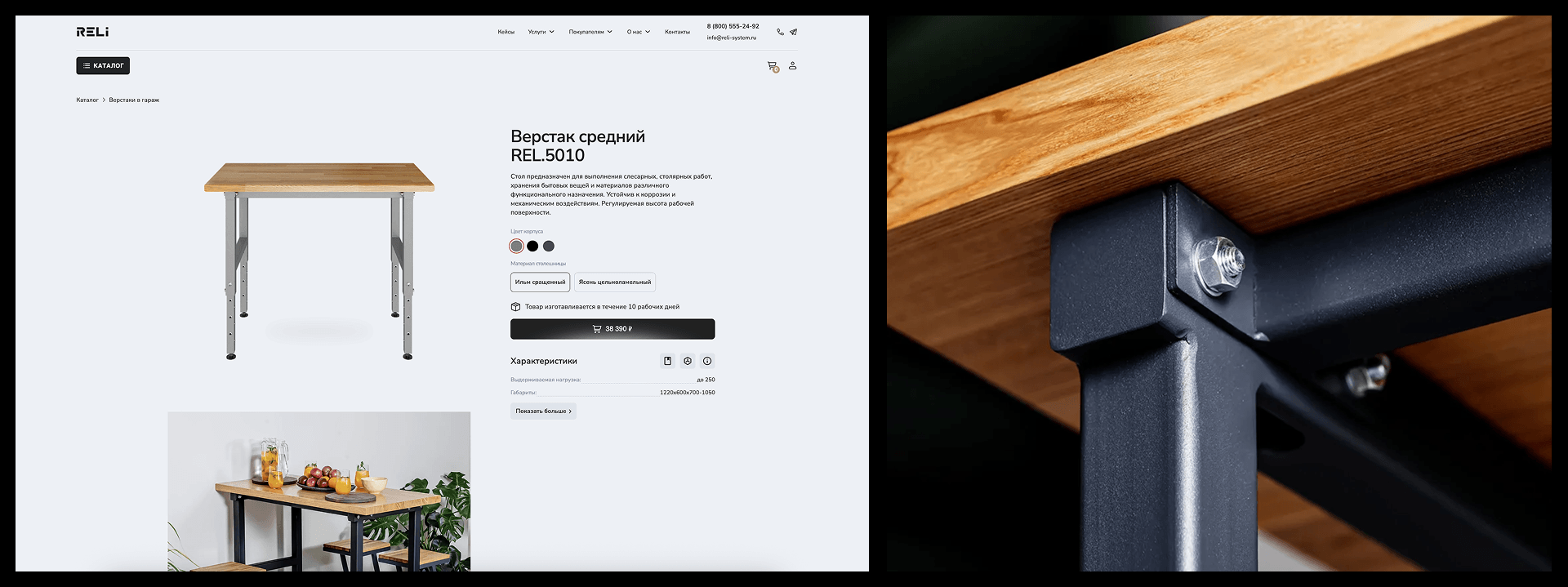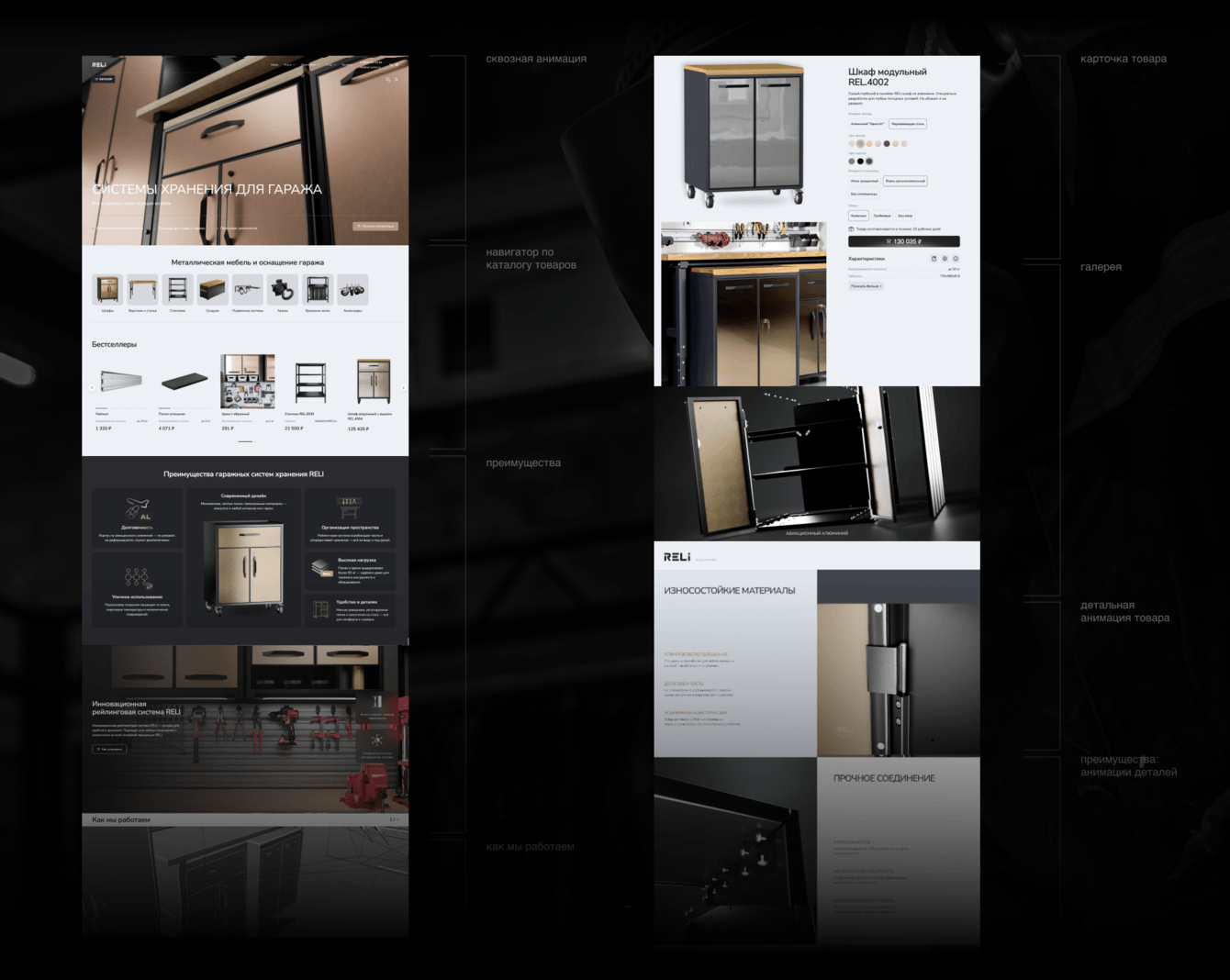 Структура сайта построена не только по категориям товаров, а еще вокруг сценариев использования. Разделы «Мастерская», «Гараж», «Спорт», «Хобби» показывают, как системы RELI решают конкретные задачи. В каждом сценарии — готовые конфигурации с возможностью кастомизации.
