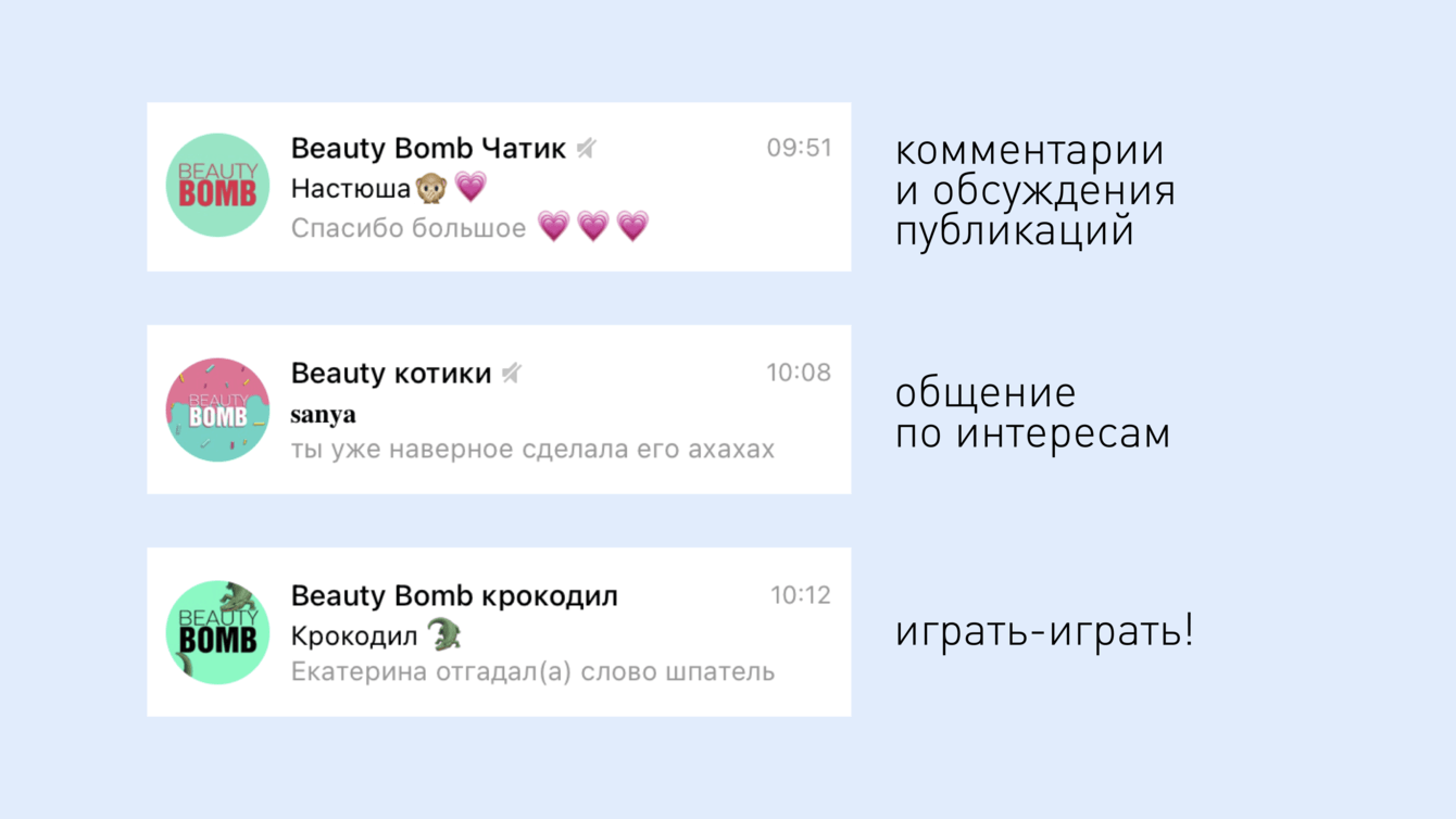 Мы взяли понятный сетевой топоним и назвали канал «Подслушано Beauty Bomb». Пообещали больше «пускать за кулисы», спойлерить, а также ещё активнее играть и общаться (мессенджер же).