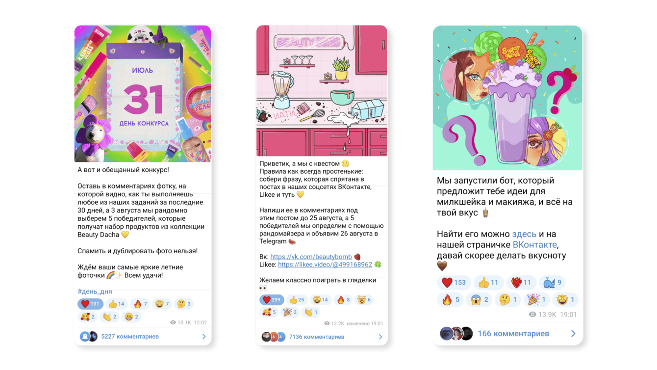 Например, в июне запустилась новая коллекция Beauty Dacha, амбассадоркой которой стала певица Алёна Швец. В честь новой коллекции мы проводили много конкурсов с различными механиками: и на рисунки, и на мейк, и на рандом. За месяц мы набрали более 2 000 подписчиков без всякого медийного продвижения!