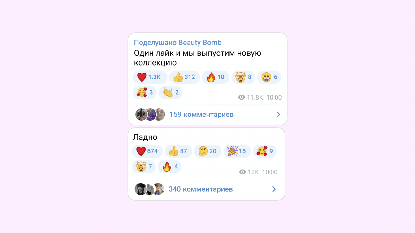 «Подслушано Beauty Bomb» — это теперь самая активная аудитория, тщательно отобранные и завербованные фанаты бренда. Они активно обсуждают, ждут и мечтают о новых продуктах. Они завлекают в эту тусовку своих подруг. Они помогают нам с аудиторными и продуктовыми инсайтами. Они обожают закрытые распродажи и конкурсы: однажды они по нашей просьбе за пару часов оставили около 8000 комментариев под видео бренда на OZON Моментах — и сервис сломался. Но это совсем другая история.