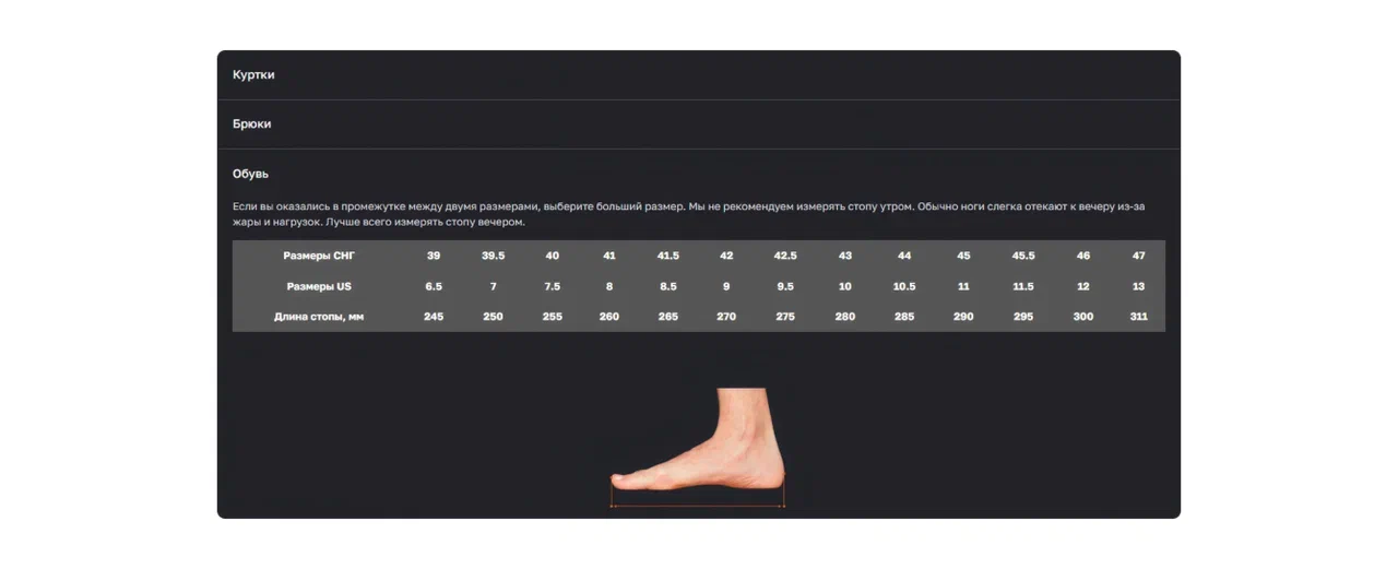 • Калькулятор размеров для точного подбора одежды и обуви.