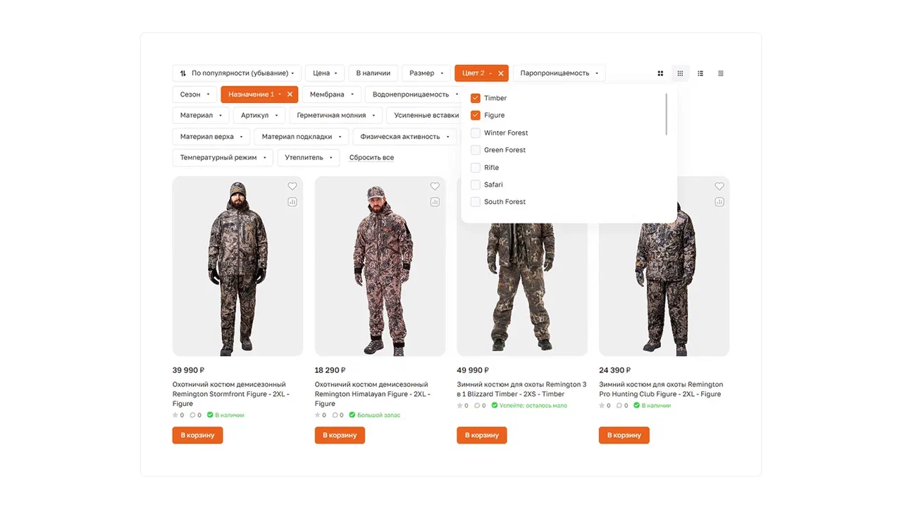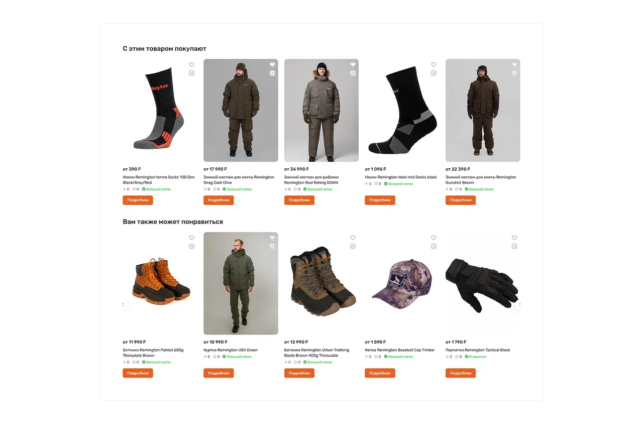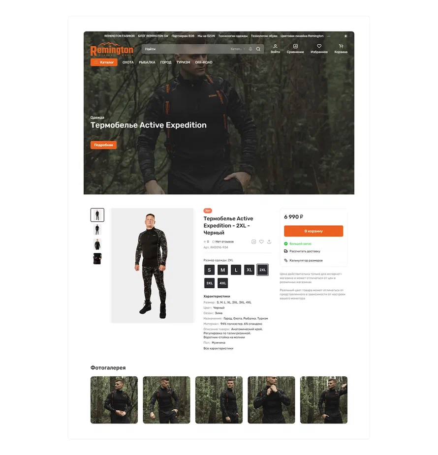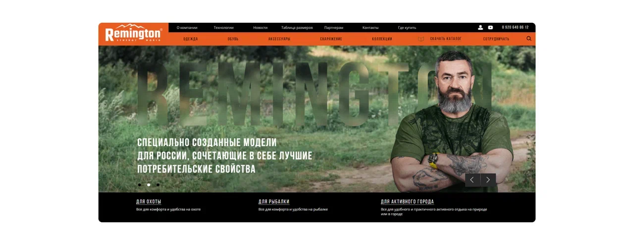 Компания Remington продает одежду, обувь и аксессуары для охоты, рыбалки и туризма. Они поставили перед нами задачу — создать интернет-магазин с возможностью онлайн-оплаты, доставки по всей России и калькулятором размеров. В их каталоге — более 500 товаров. Требуется удобный сайт, который улучшит клиентский опыт и ускорит процессы покупки.
