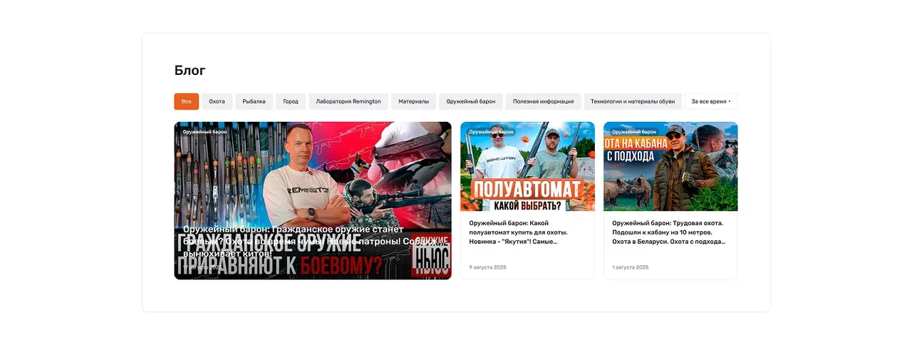 • Блог. С блогом Remington мы интегрировали поиск по тематическим тегам и годам выпуска, чтобы пользователи могли легко находить интересные статьи.