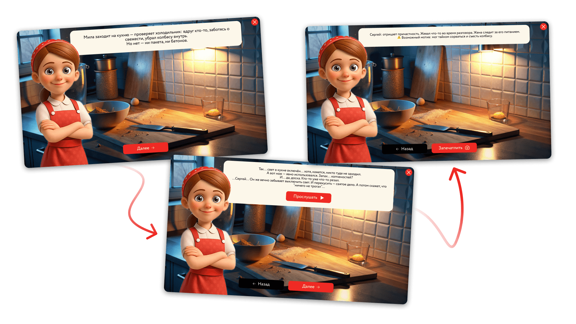 Сюжет был построен как цепочка противоречивых улик и сменяющихся версий. Каждое новое доказательство выглядело убедительно, но одновременно разрушало предыдущую гипотезу. До финального этапа у пользователя не возникало ощущения, что развязка очевидна.
