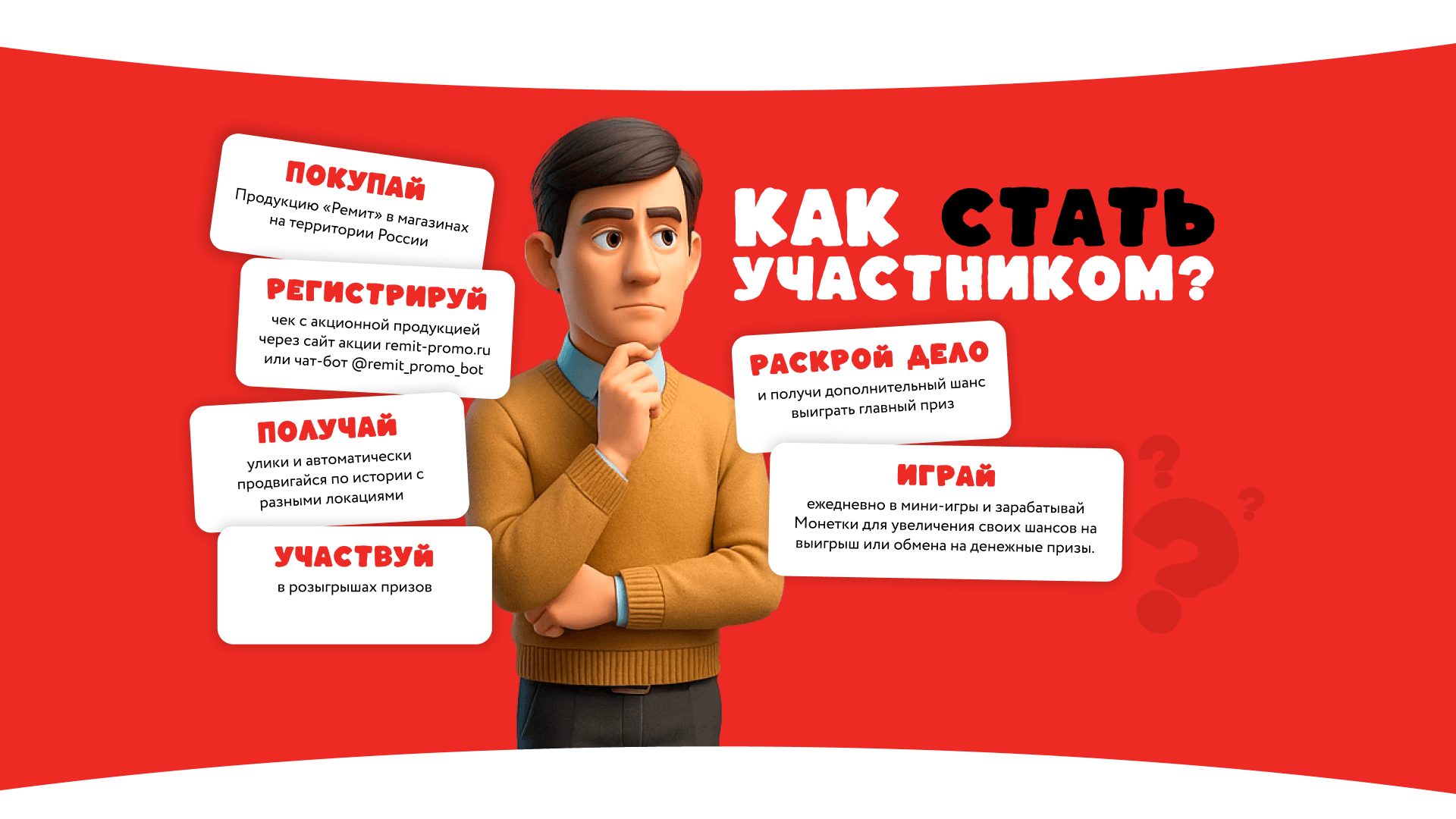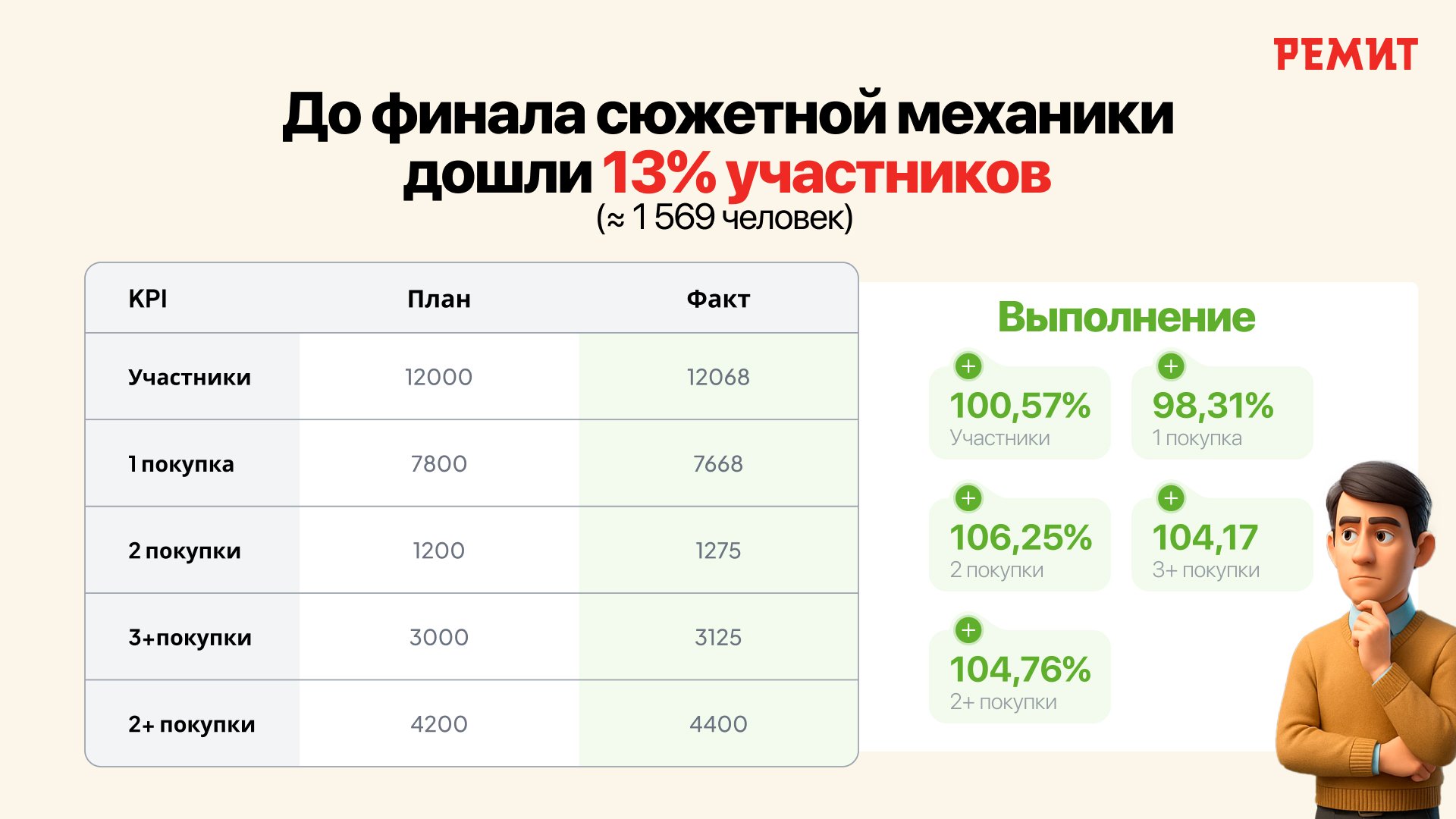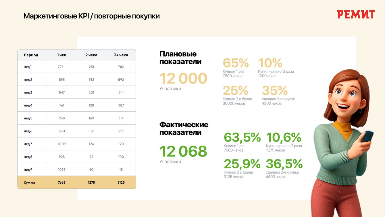 В FMCG чековые промо в основном дают краткосрочный контакт с брендом. В категории мясной гастрономии до 52% продаж приходится на промо, что усиливает зависимость от скидок, но не формирует устойчивого покупательского поведения. Стандартный сценарий — покупка, регистрация чека, ожидание розыгрыша. В условиях высокой конкуренции такая модель не удерживает внимание и не приводит к повторному участию. Перед РЕМИТ стояла задача изменить этот подход и создать промо, которое возвращает пользователя без дополнительных стимулов. При этом решение должно было быть применимо для массовой аудитории, работать в офлайн-ритейле, оставаться в рамках чековой механики и не опираться на скидки или постоянную медийную поддержку.