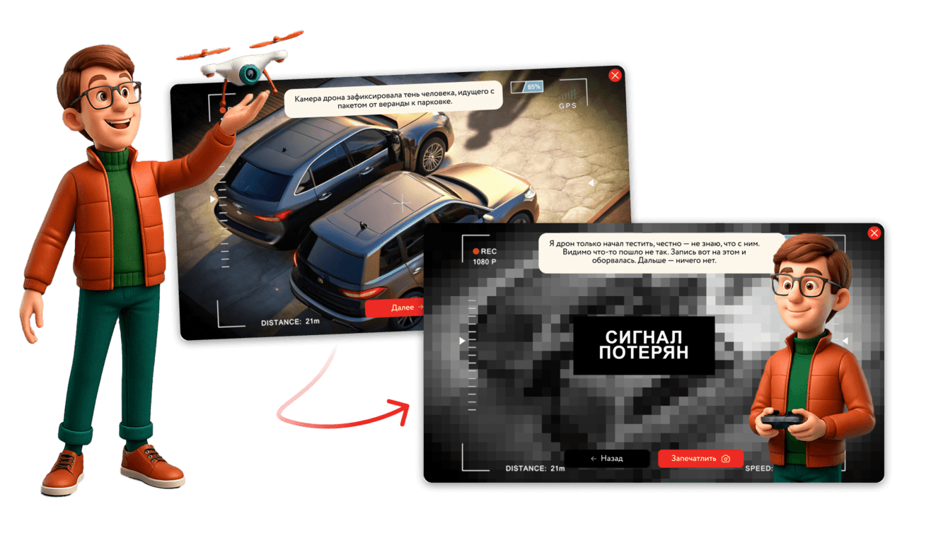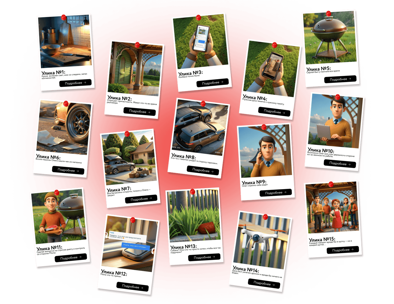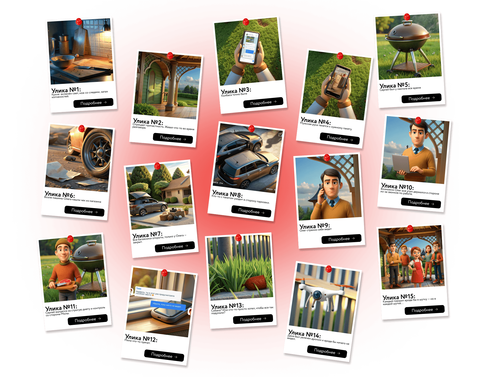 Улики приходили в разных формах: переписки, фотографии, аудиофрагменты разговоров, стоп-кадры видео, комиксные зарисовки. Никаких пояснений «что это значит». Только факты, намёки и ложные следы. Одни улики выглядели убедительно, другие — подозрительно, третьи противоречили предыдущим. Пользователь сам решал, чему верить.
