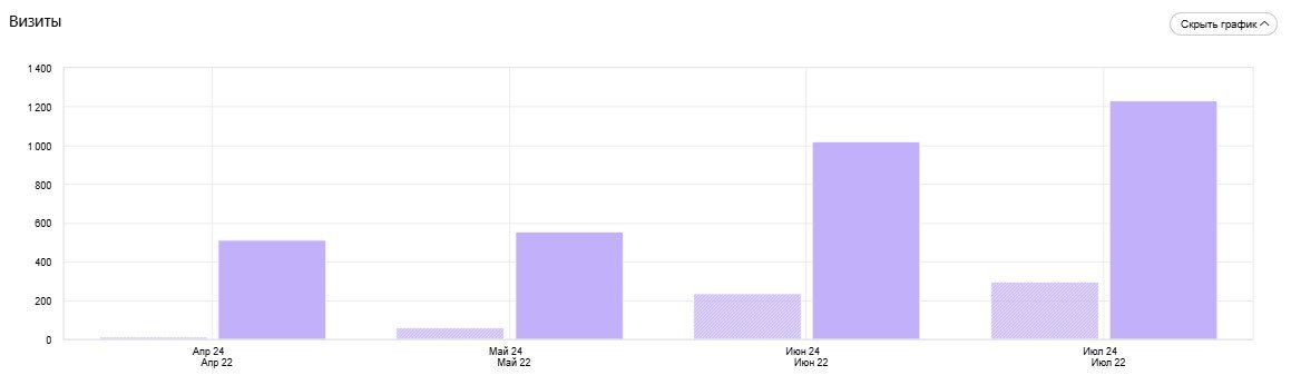 В настоящее время сайт получает до 1200 переходов из ПС. Этот график наглядно показывает соотношение поискового трафика до и после продвижения: