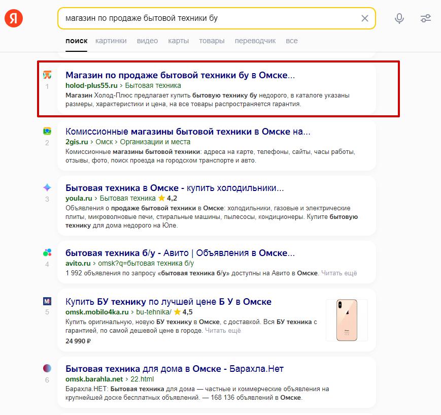 Эта товарная группа имеет очень высокую конкуренцию со стороны Авито и других агрегаторов. В качестве решения проблемы были проведены работы по повышению кредита доверия поисковых систем. Составлена грамотная презентация для сниппетов, привлекательные заголовки карточек.