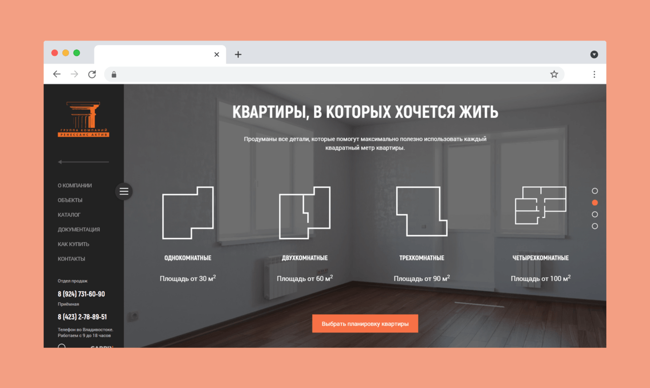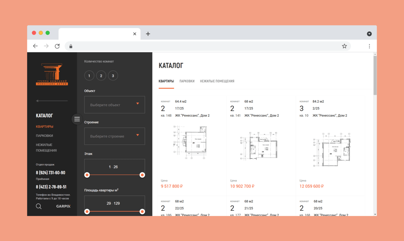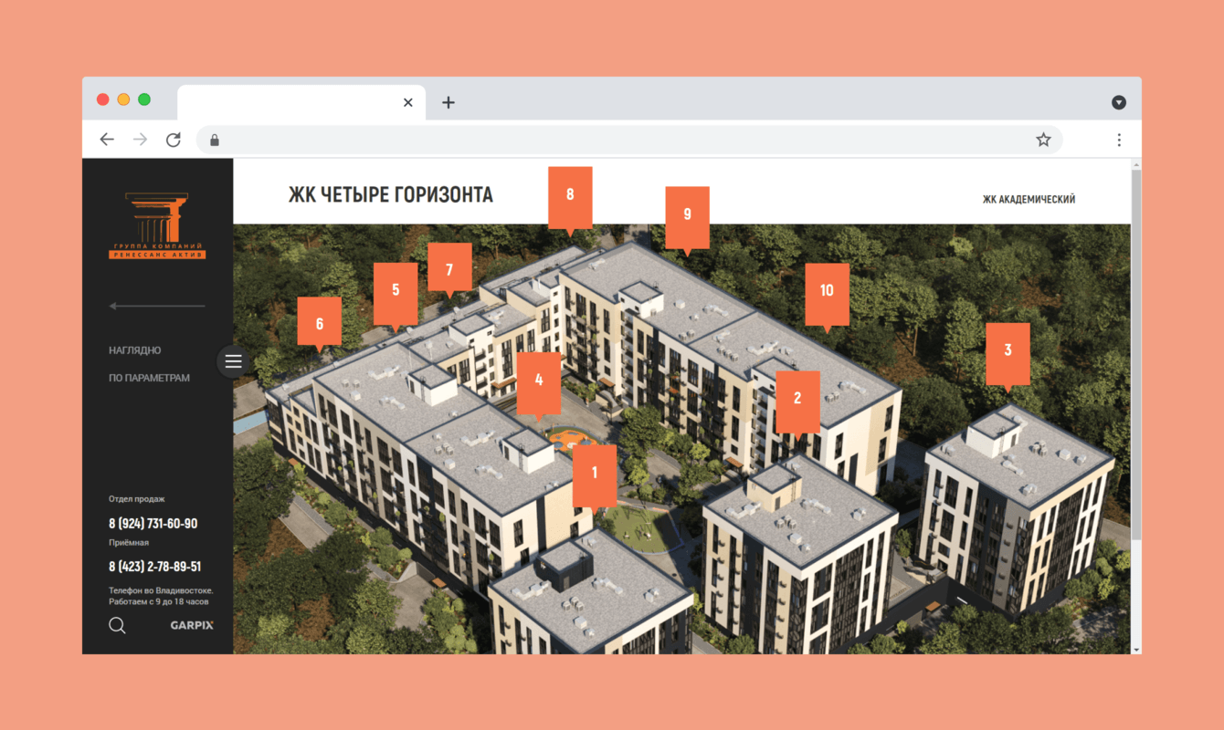 1. Навигация выстроена так, чтобы пользователю было максимально удобно найти нужную квартиру: для этого внедрены дополнительные фильтры. Пользователь может выбрать на сайте желаемый жилой комплекс, на схеме выбрать этаж и посмотреть схемы планировок и наличие свободных квартир на каждом этаже. Пользователь видит в разрезе каждой лестничной площадки сколько есть свободных квартир, площадь и стоимость.