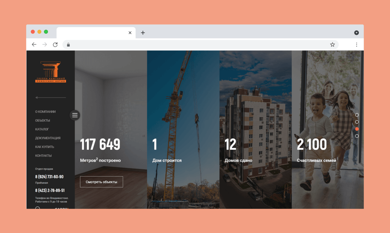 3. Были использовали фирменные цвета компании «Ренессанс Актив». У компании оранжевый логотип, поэтому нужно было найти грамотное сочетание. Сайт выполнен в черно-оранжевой цветовой гамме, что выглядит достаточно гармонично.