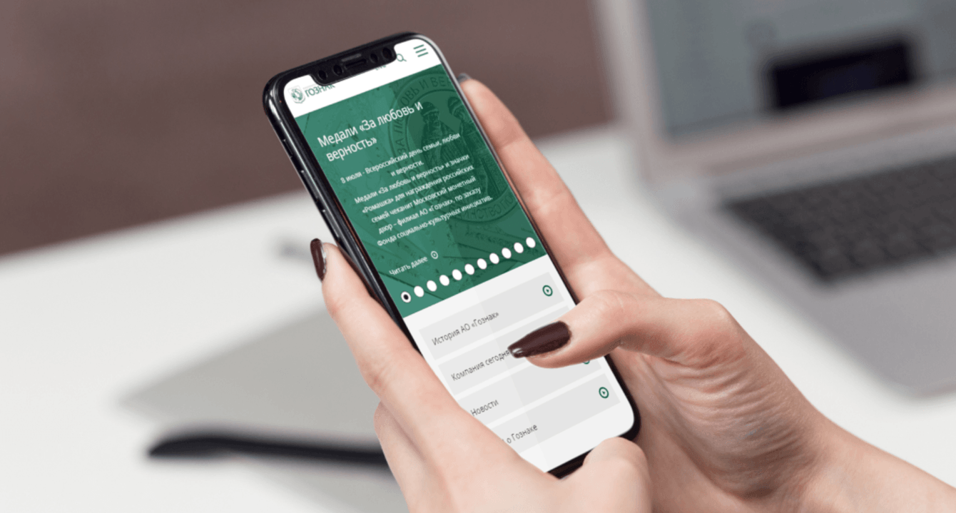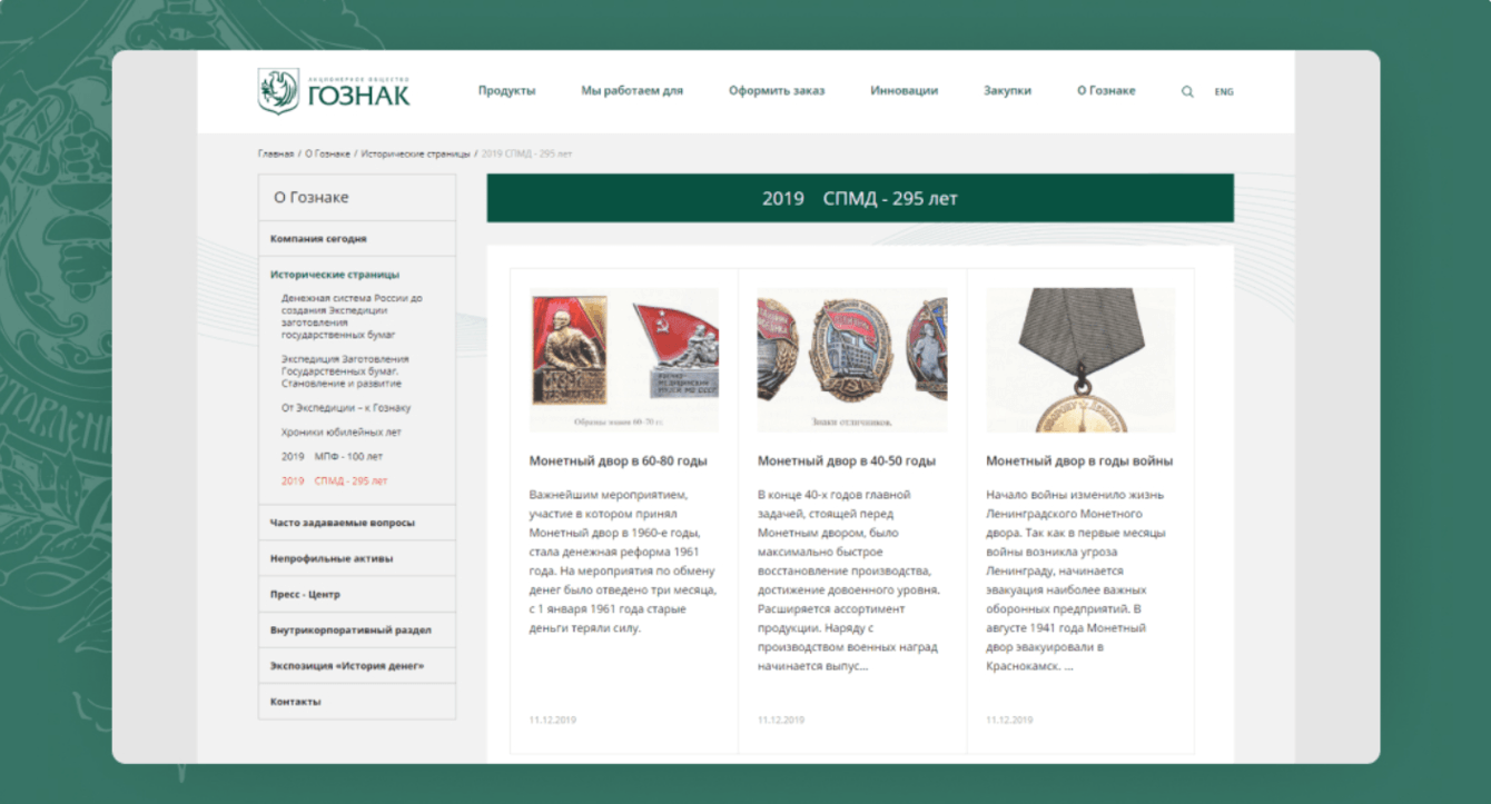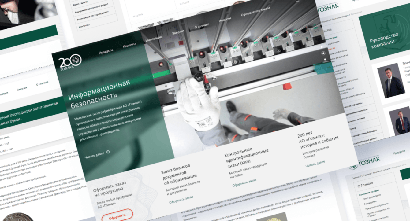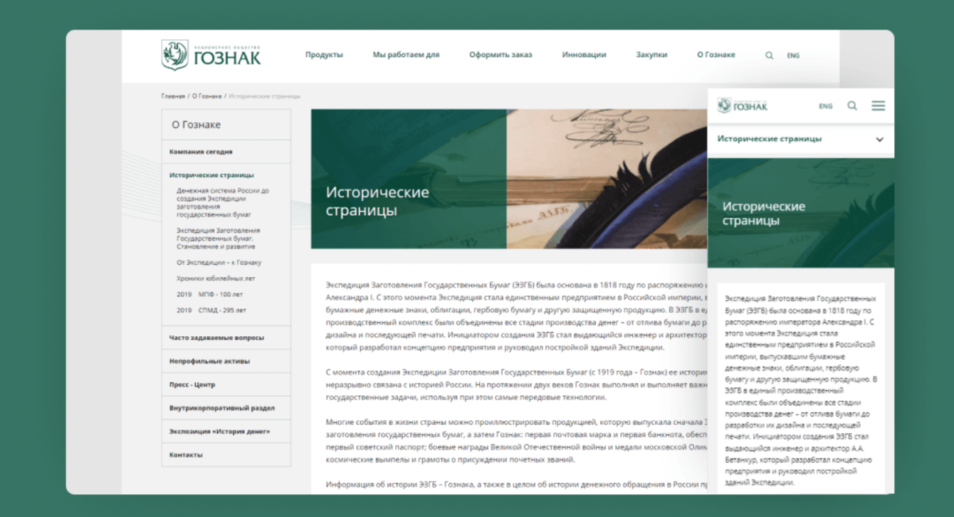 АО «Гознак» является одной из старейших компаний России. Этот факт необходимо было отразить на сайте таким образом, чтобы информация органично вписывалась в общую дизайн-концепцию. Мы добавили различные графические элементы, которые имеют отношение либо к фирменному стилю компании, либо к ее многолетней истории. Так, например, на главной странице в качестве фоновой иллюстрации использовано изображение эмблемы Экспедиции Заготовления Государственных Бумаг (ЭЗГБ).