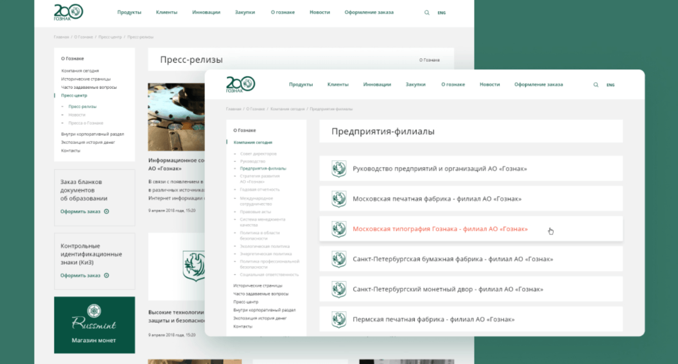 Создать новый дизайн и обновить верстку главного сайта, а также восьми сайтов предприятий-филиалов. Имидж имеет особое значение для предприятий государственной важности, таких как «Гознак». Ресурс должен быть современным, с удобной навигацией и всей необходимой информацией. С другой стороны важно, чтобы сохранился консервативный подход к обновлению сайт.