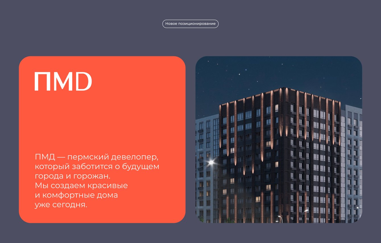 Пермский девелопер ПМД решился на изменения. Прежнее позиционирование «Надежный застройщик» перестало отличать компанию, став стандартом в отрасли. Кроме того, у ПМД появились новые проекты в комфорт-классе за пределами центра, и вместе с ними — потребность быть ближе к аудитории. Мы сохранили фирменный стиль, но заново выстроили платформу бренда, сделав акцент на связи с городом.