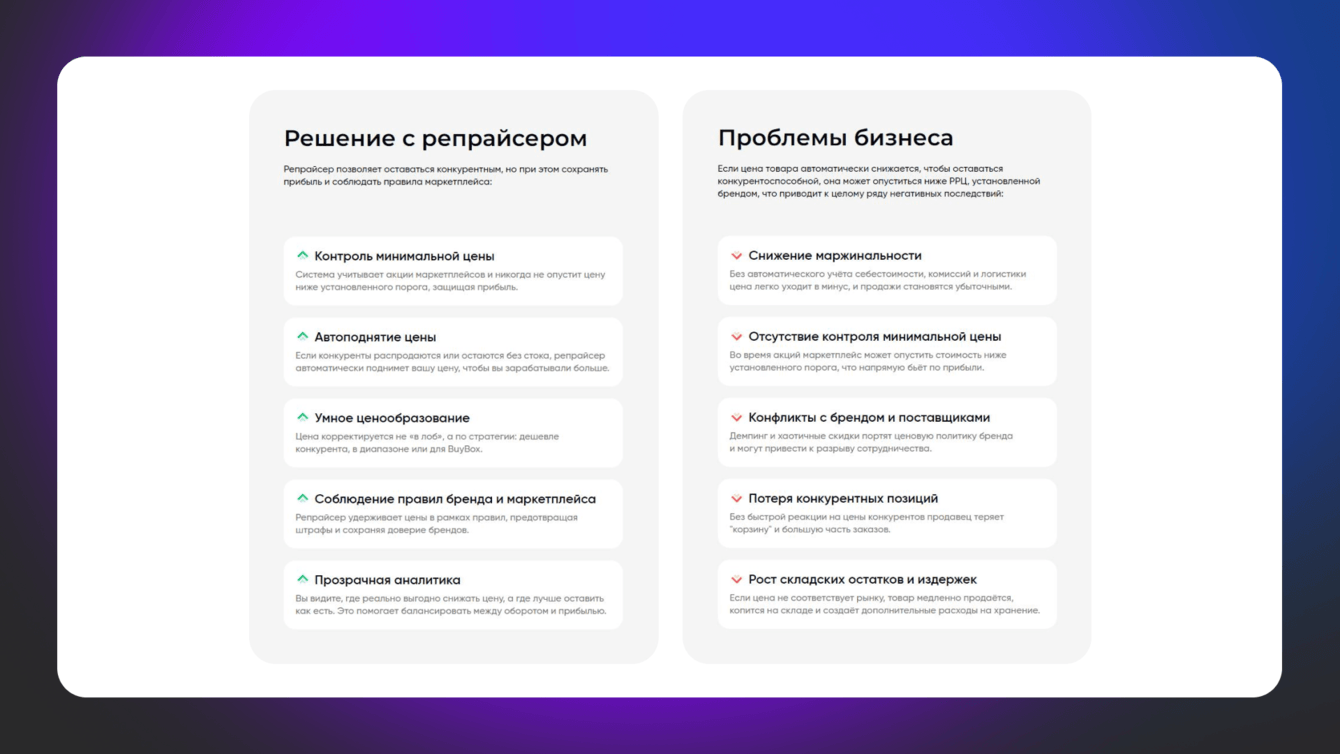 1. Автоматически корректирует стоимость товаров с учётом акций маркетплейсов и минимального порога, чтобы сохранять маржу и позиции в выдаче.