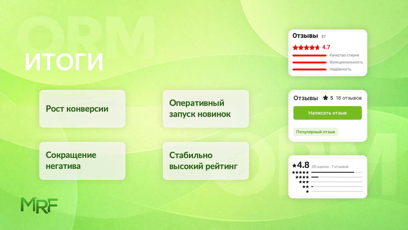• 70+ «проблемных» SKU с рейтингом ниже 3 выведены на стабильные 4,5+ звезды