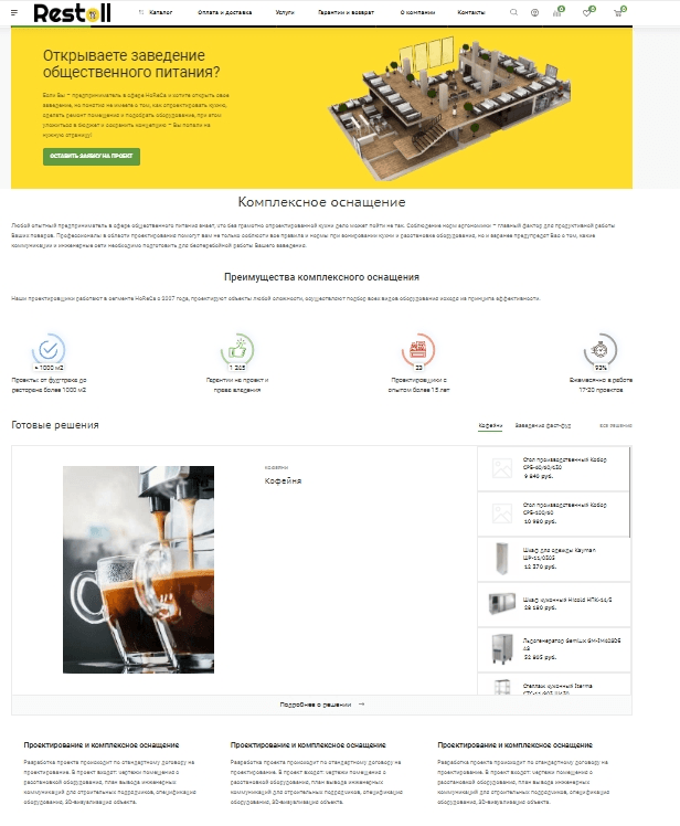 Страницу «Комплексное оснащение» дополнили блоком готовых решений для различных типов заведений. Посетители могут сразу увидеть подходящее оборудование и ориентировочную стоимость проекта.