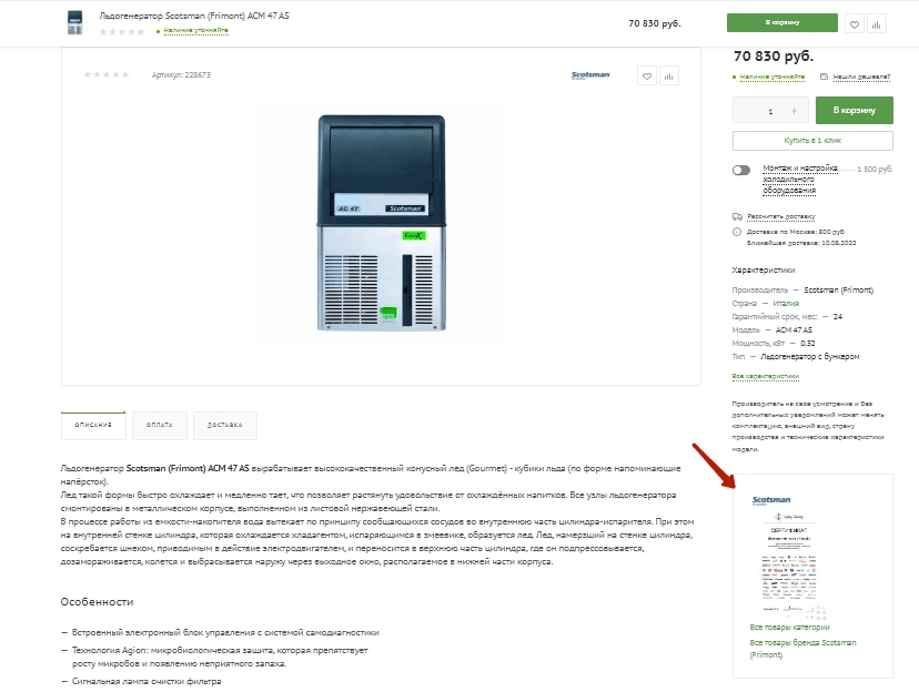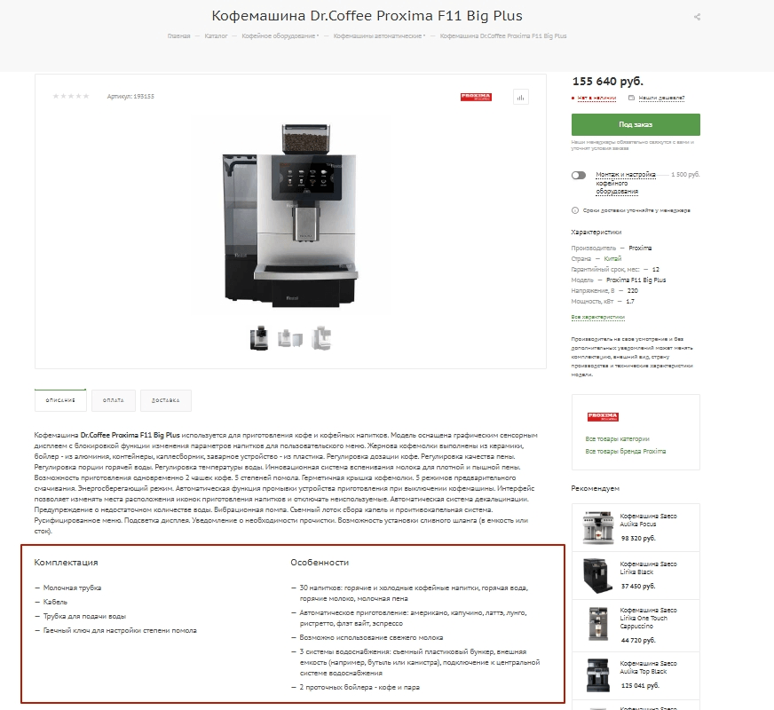 Команда использовала возможности платформы для создания информативных страниц продукции. В дополнительное описание добавили детали о комплектации и технических характеристиках оборудования.