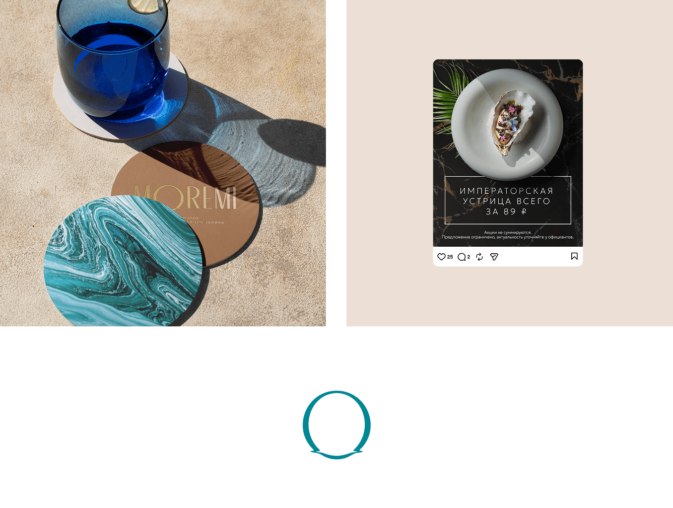 Логотип построен вокруг фирменной буквы O, отражённой в воде. Простой жест, который сразу задаёт тон бренда: тишина, гладь, движение света на поверхности.