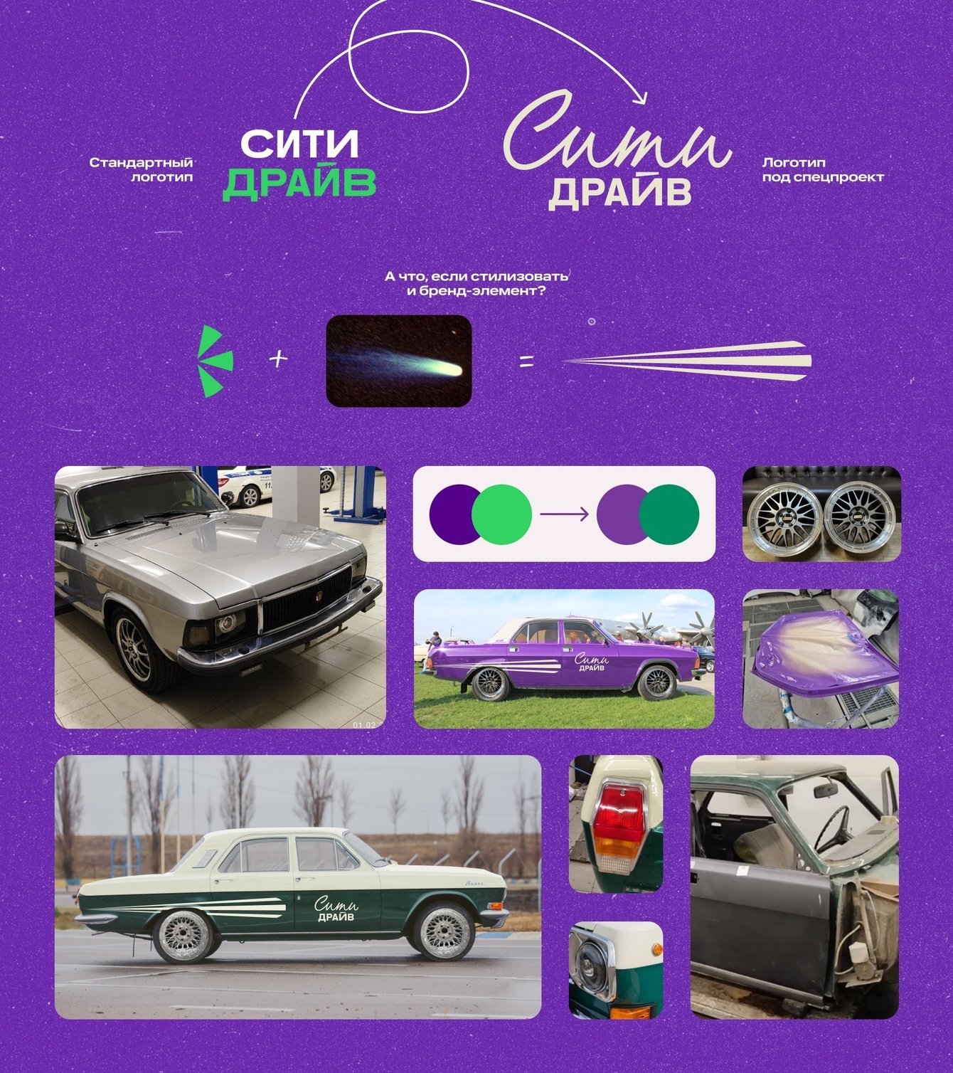 Также была создана ретро-версия логотипа Ситидрайва в советском стиле, вдохновением для которой послужили экспонаты музея ГАЗ. Бренд-элемент искры был переработаны в духе космической тематики, дополняя визуальный образ. Дополнительно логотип был помещен на ручку коробки передач.