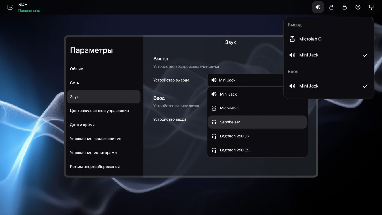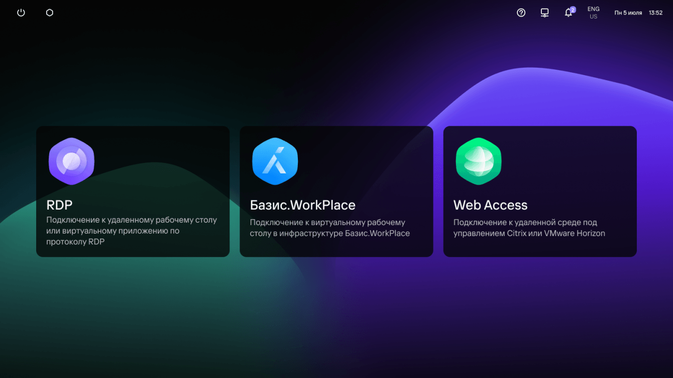 Интерфейс обеспечивает быстрый и интуитивно понятный доступ к виртуальной среде. Пользователи могут легко выбирать способ подключения к удаленному рабочему столу, запускать необходимые приложения, переключаться между рабочими пространствами и пользоваться всеми функциями операционной системы без лишних сложностей. Всё это реализовано с учетом производительности тонких клиентов, обеспечивая мгновенный отклик и комфортное взаимодействие.