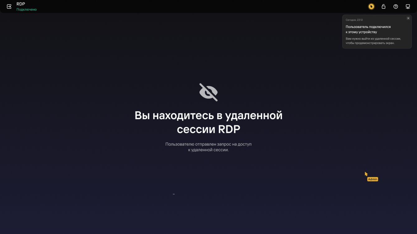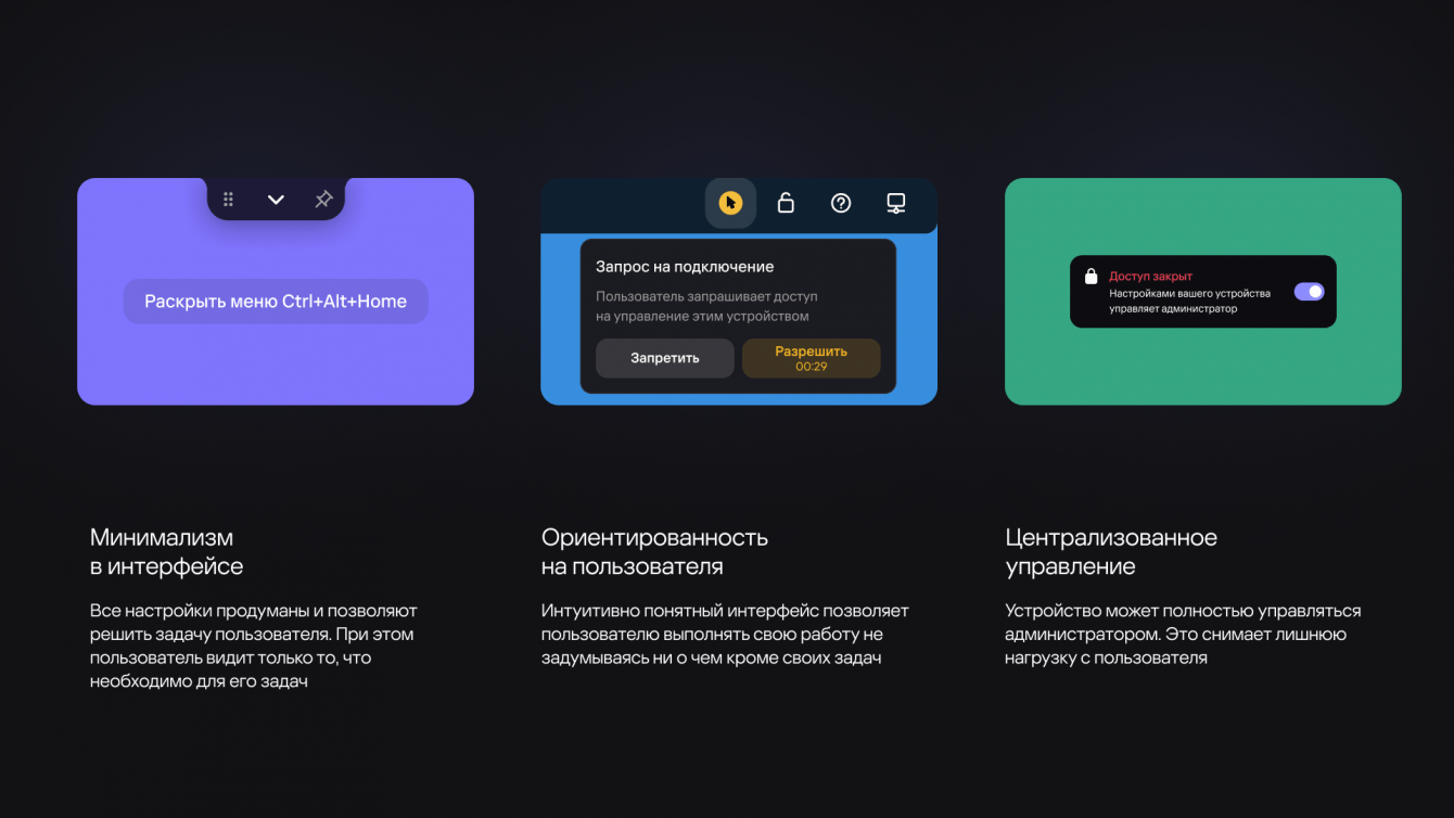 Интерфейс администратора позволяет одновременно управлять тысячами устройств и при этом фокусироваться на одном при необходимости. Администратор может удаленно управлять большим парком устройств без необходимости личного присутствия у рабочего места пользователя.