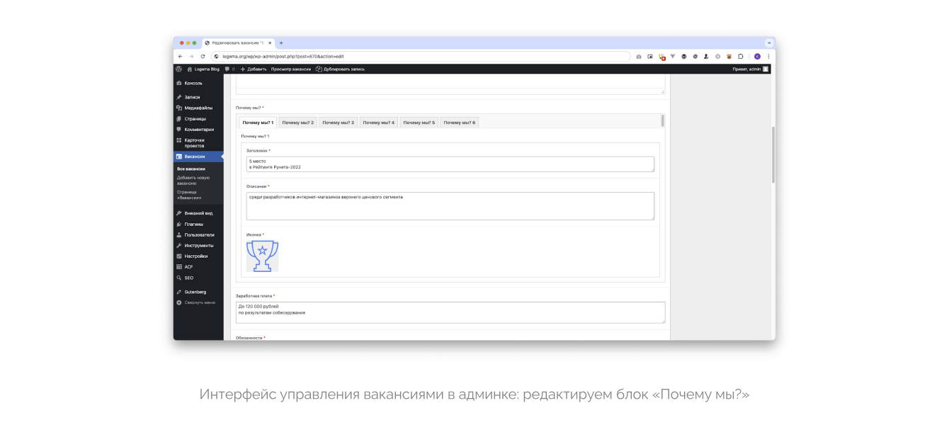 Мы решили применить подход в духе ИТ-компании — предоставить возможность HR самостоятельно размещать вакансию через админку WP.