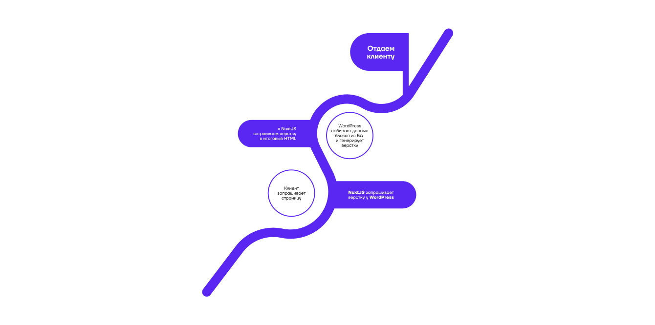 — Разработанное решение позволяет NuxtJS через API получать HTML-верстку, сгенерированную WordPress, и встраивать ее на страницу.