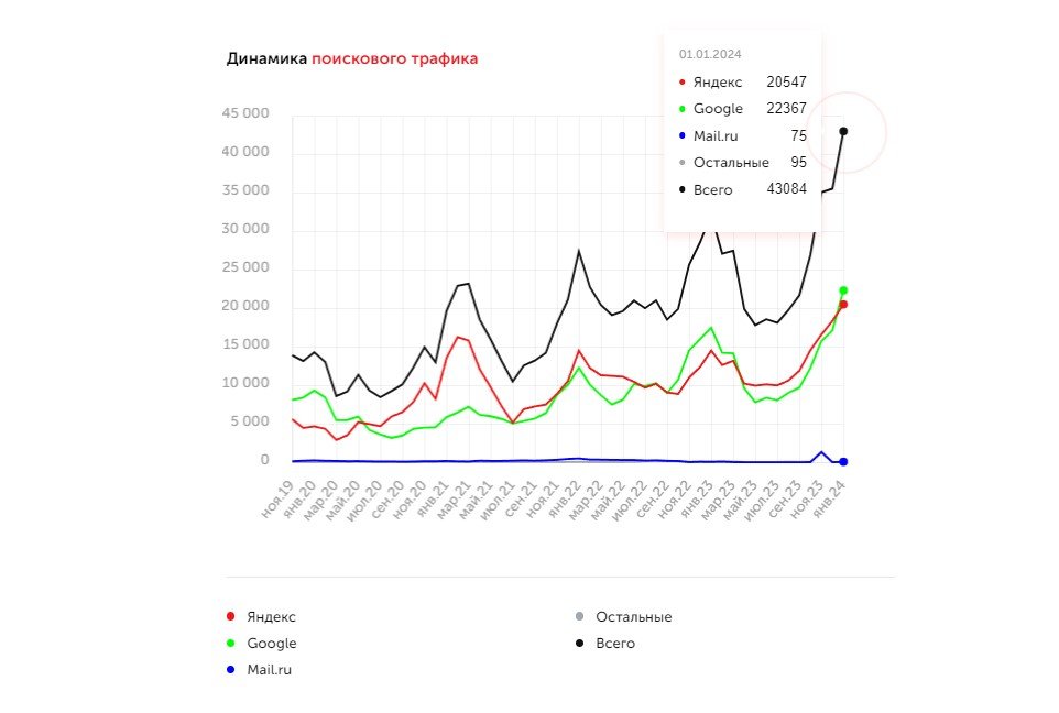 Несмотря на сезонность бизнеса и падения сервера, мы добились планомерного роста трафика из поисковых систем. За 4 года трафик вырос в 3 раза.
