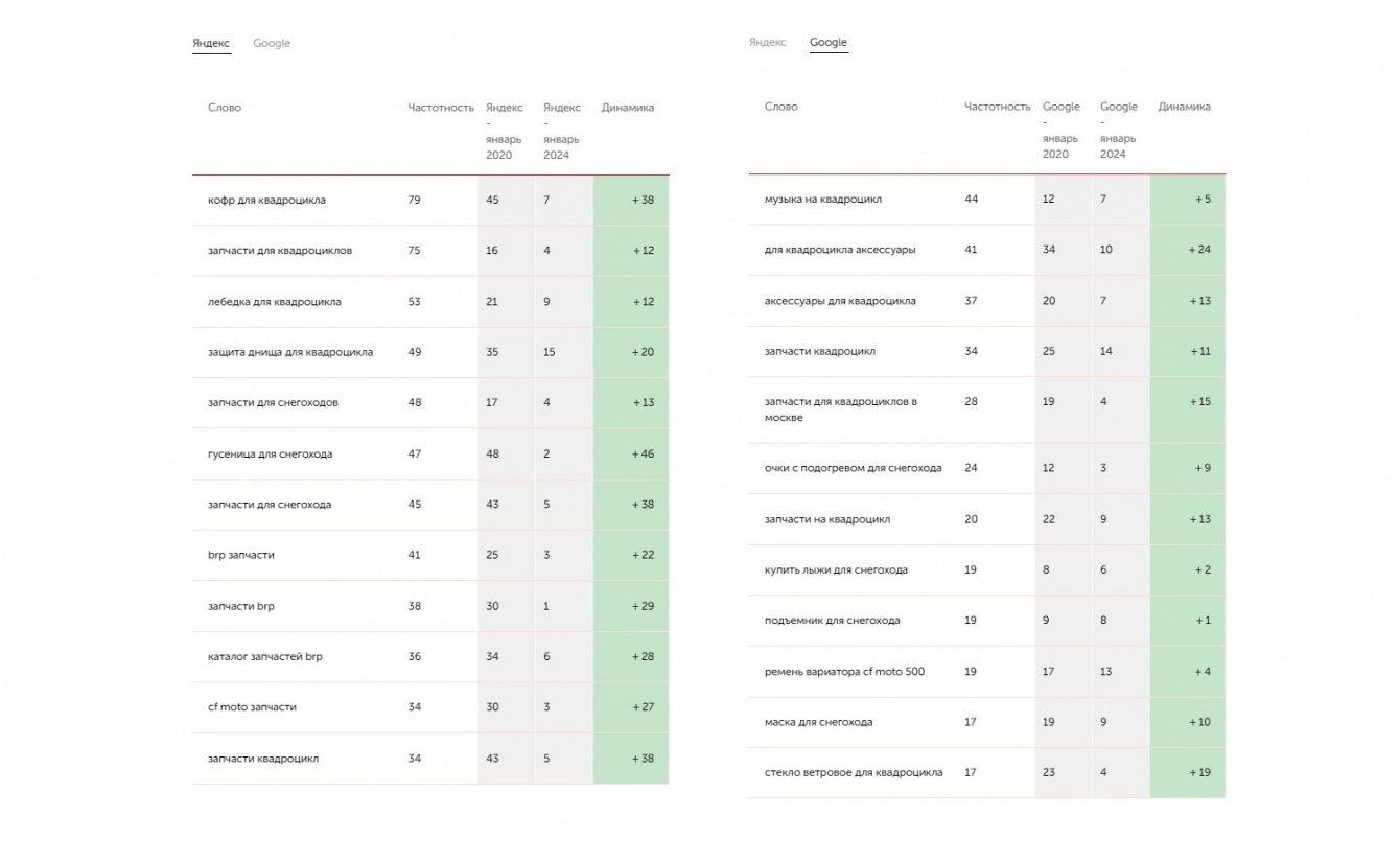 Мы отследили динамику за 4 года. По сравнению с 2020 годом рост позиций увеличился на 30-40 %. 67 % запросов уверенно вошли в топ-5 Яндекса. 83 % запросов вошли в топ-10 Google.