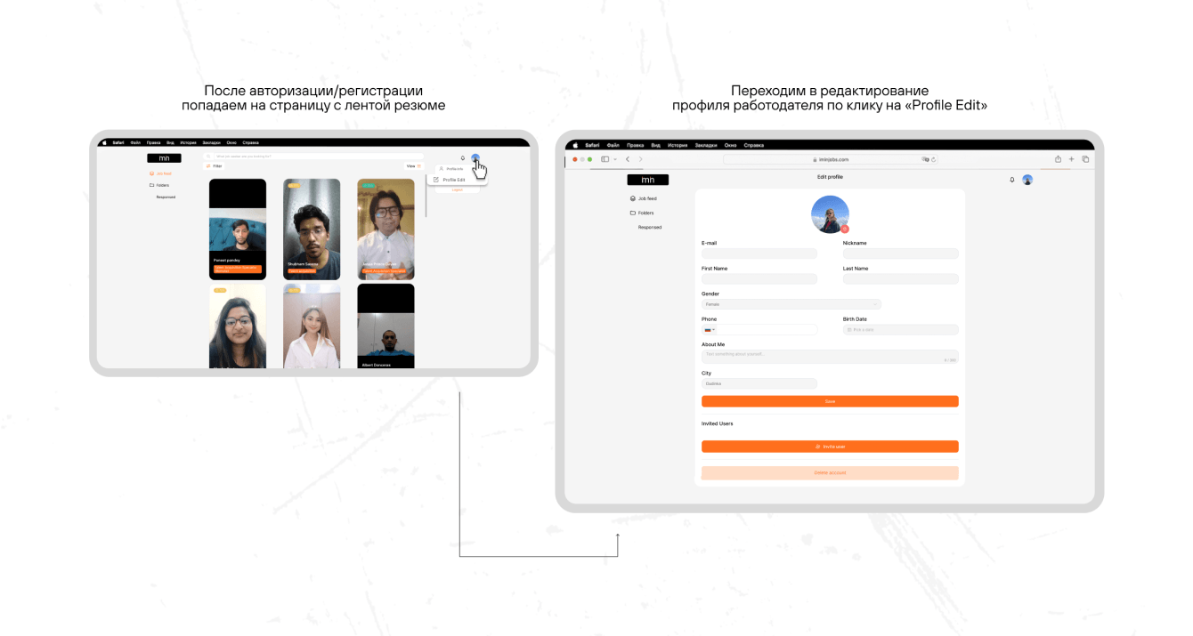 После изучения product discovery, проведенного командой клиента, мы приступили к разработке веб-версии. Веб-версия нужна была рекрутерам, им оказалось удобнее пользоваться сайтом, а не приложением, потому как работают они преимущественно за ПК.