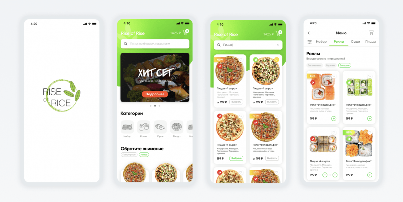 В данном мобильном приложении мы сделали акцент на большом количестве визуальных образов: фотографии блюд с возможностью выбора соответствующих модификаторов, удобного процесса оформления заказа, информационный личный кабинет и многое другое.