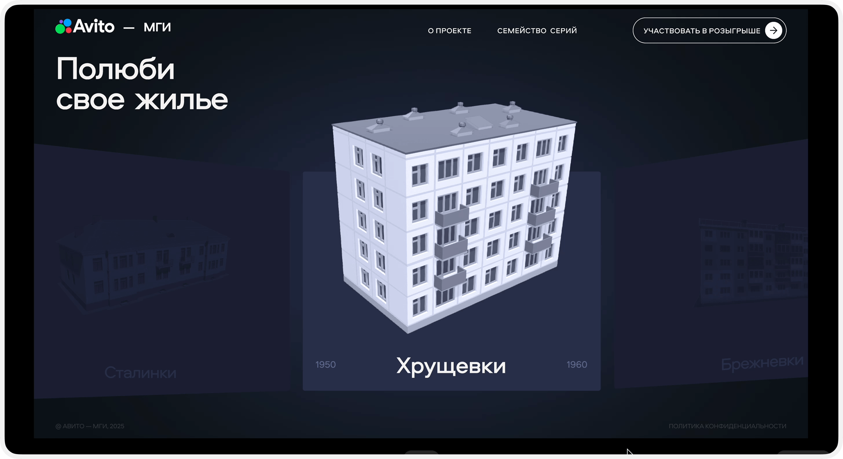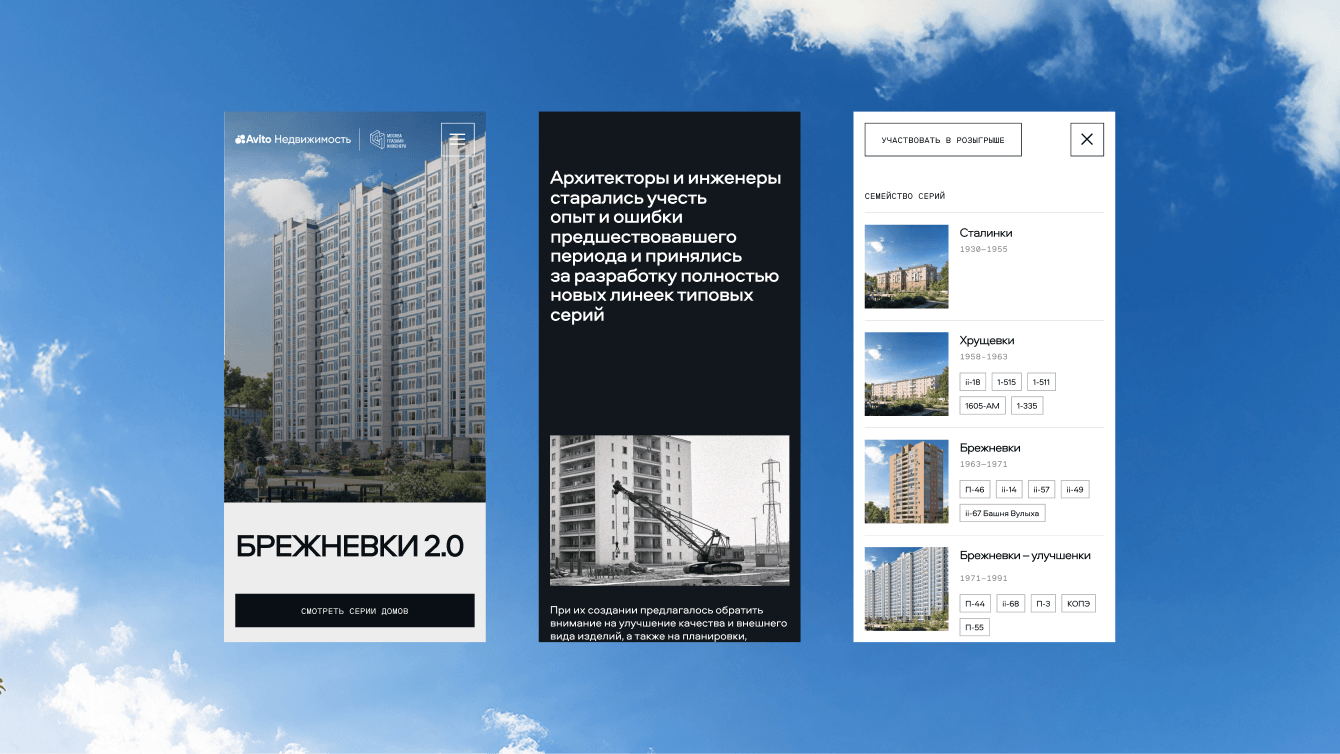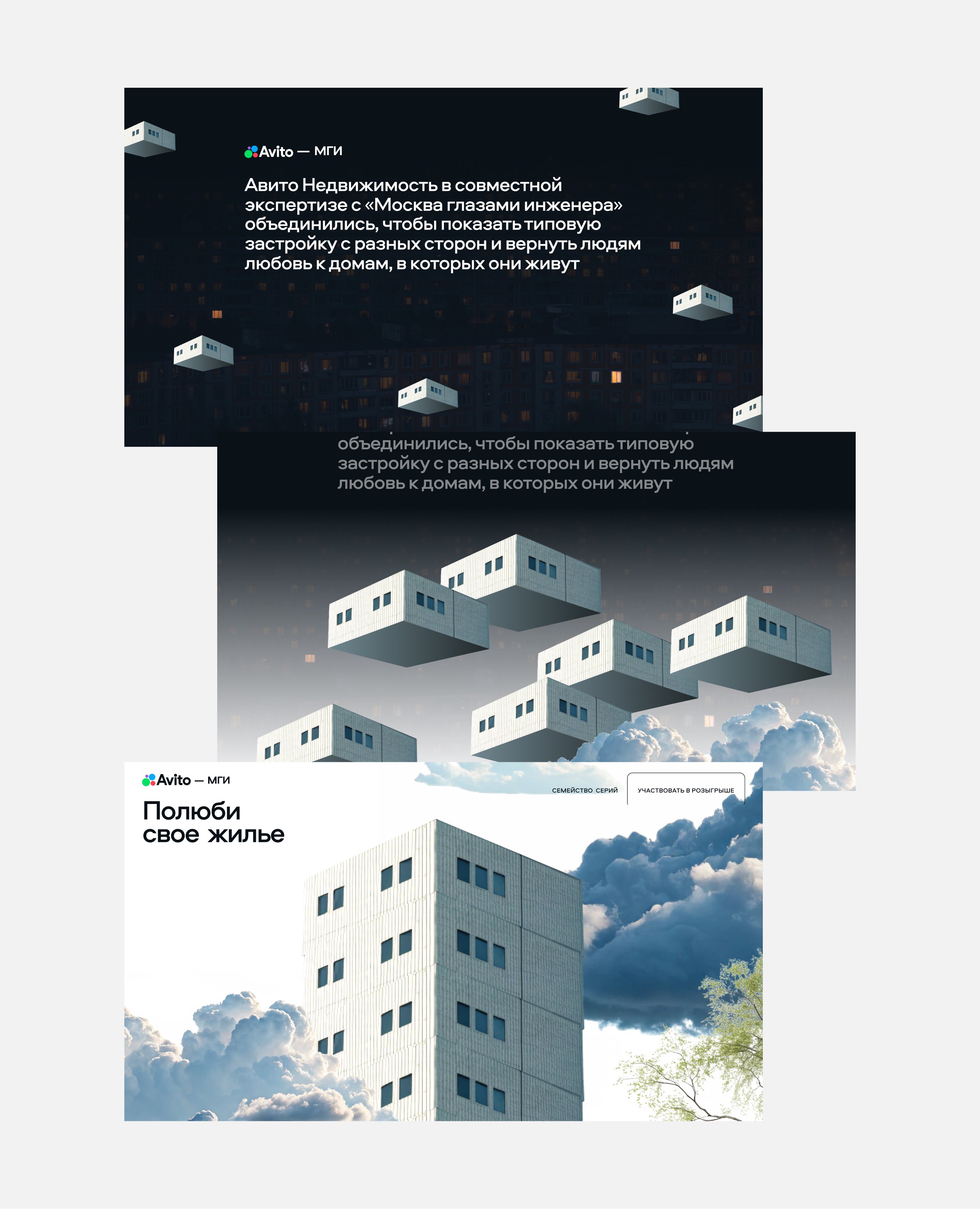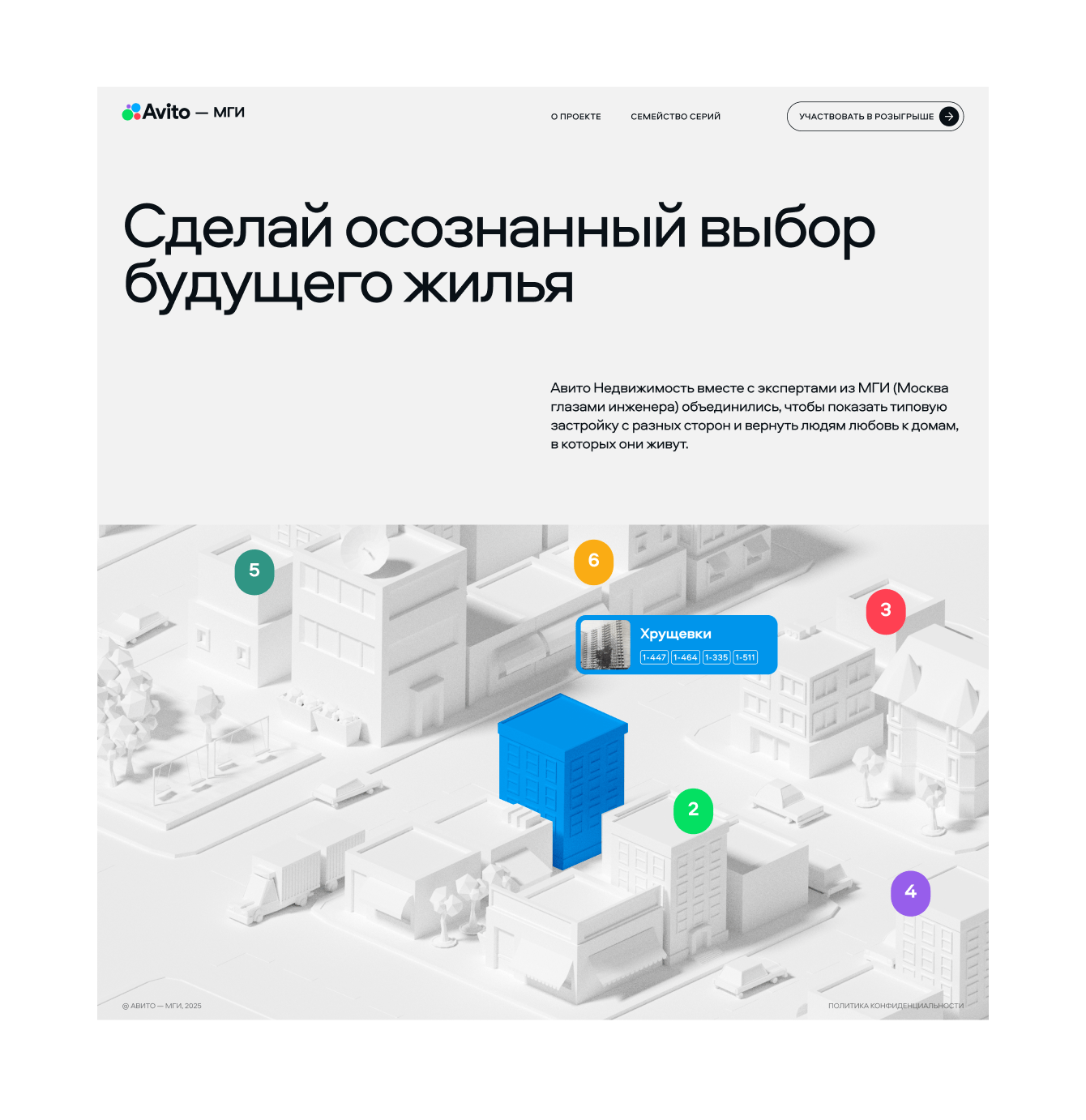 Лендинг не только предлагает поменять отношение к типовому жилью, но и решает важные задачи: раскрывает инженерную ценность привычных многоэтажек, укрепляет имидж Авито Недвижимости как эксперта в области жилья и поддерживает образовательные инициативы МГИ.
