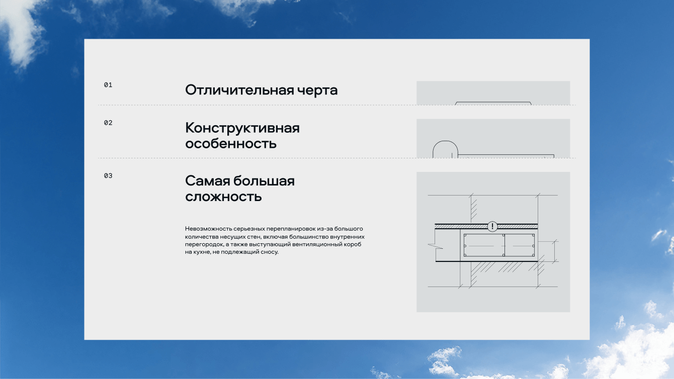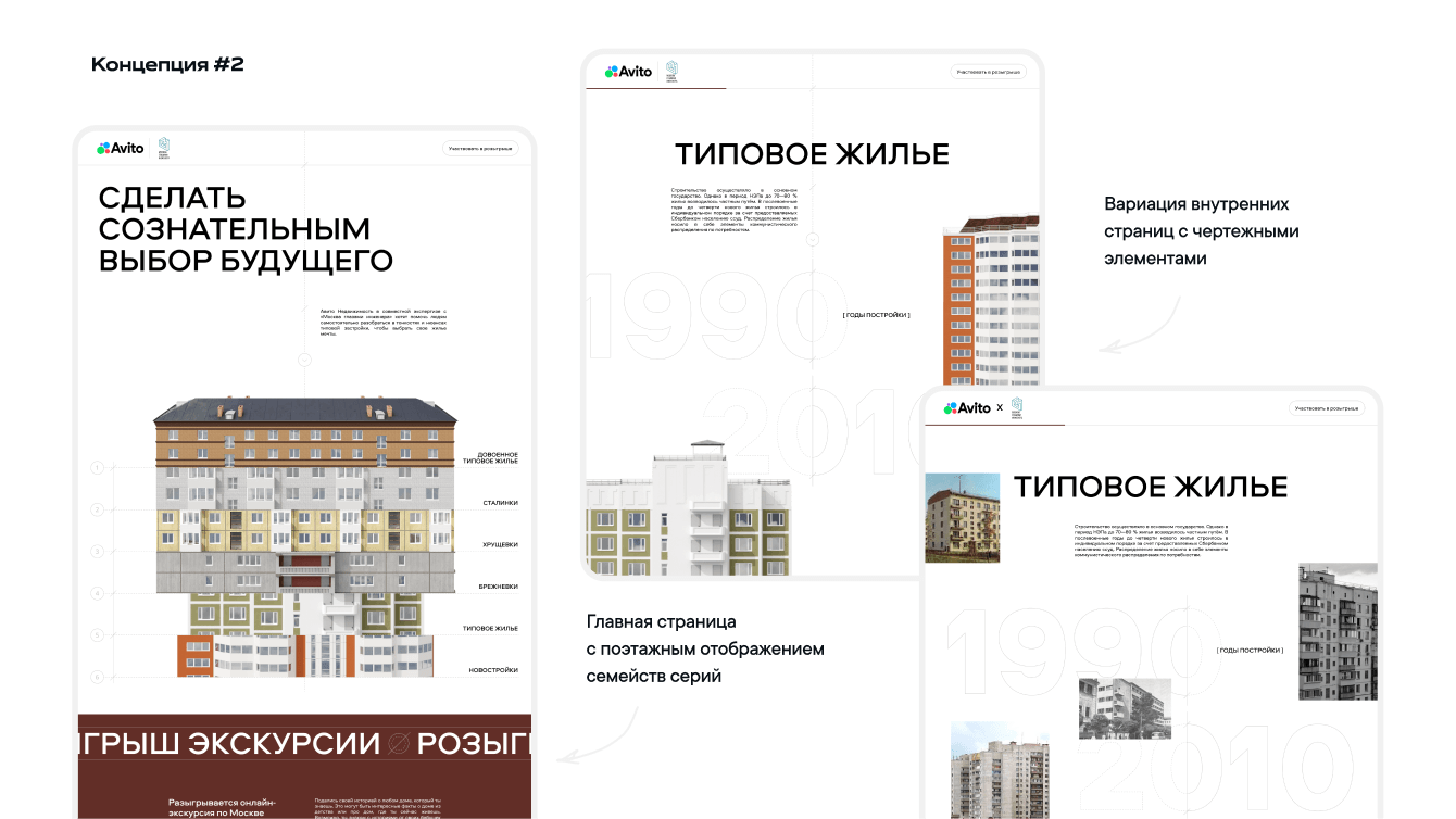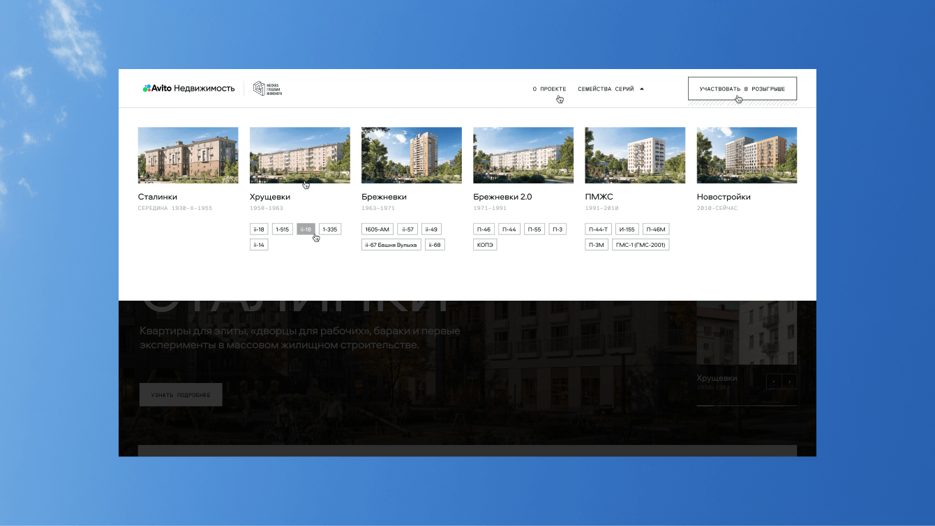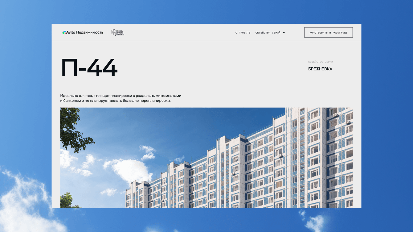 Лендинг не только предлагает поменять отношение к типовому жилью, но и решает важные задачи: раскрывает инженерную ценность привычных многоэтажек, укрепляет имидж Авито Недвижимости как эксперта в области жилья и поддерживает образовательные инициативы МГИ.