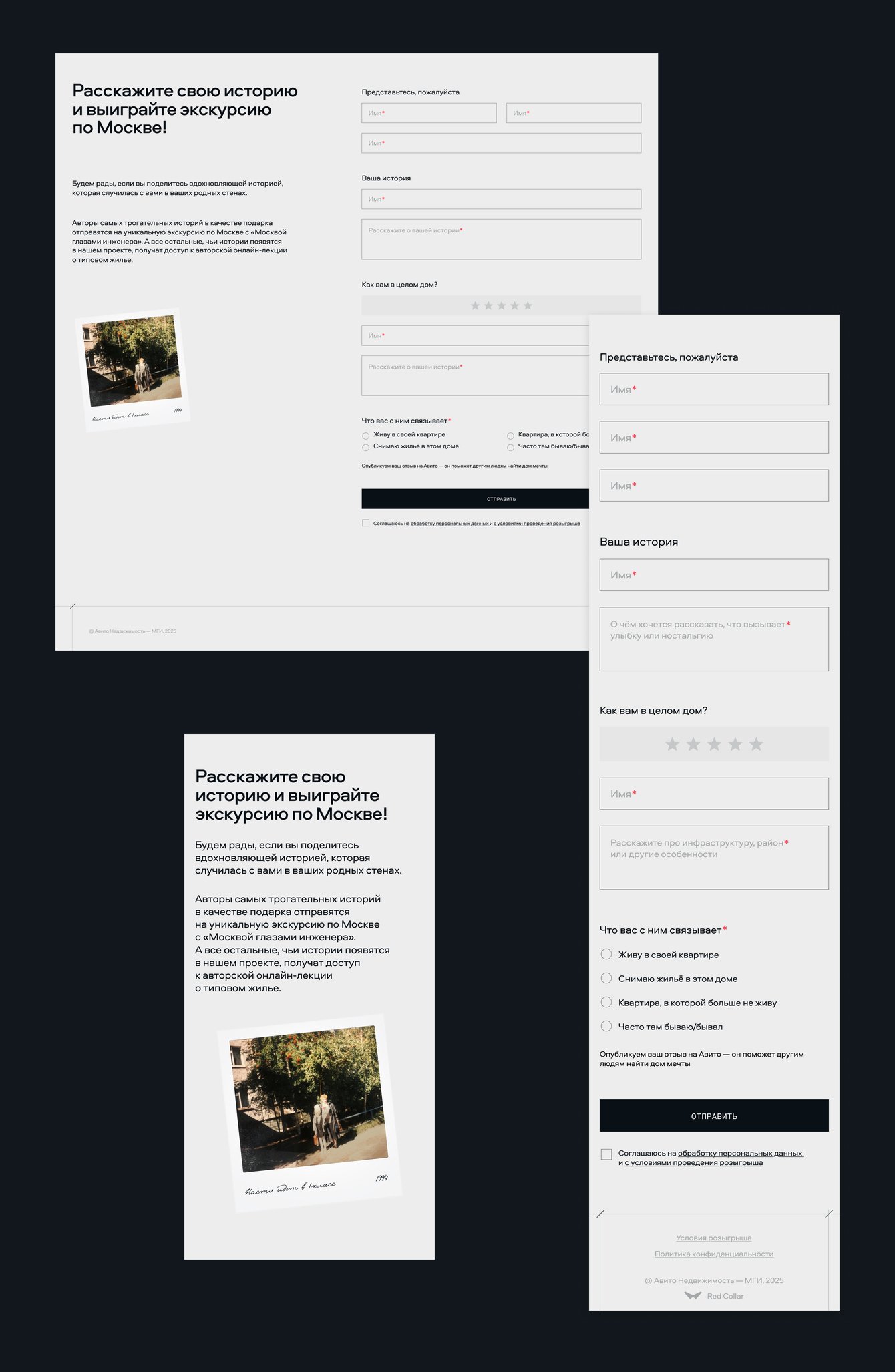Реализовали механику сбора историй — предложили пользователям форму, где они могли поделиться своими воспоминаниями. Каждый, кто рассказал свою историю — про дом, в котором жил, живет или хотел бы жить, — становился участником розыгрыша экскурсии по столице от экспертов МГИ.
