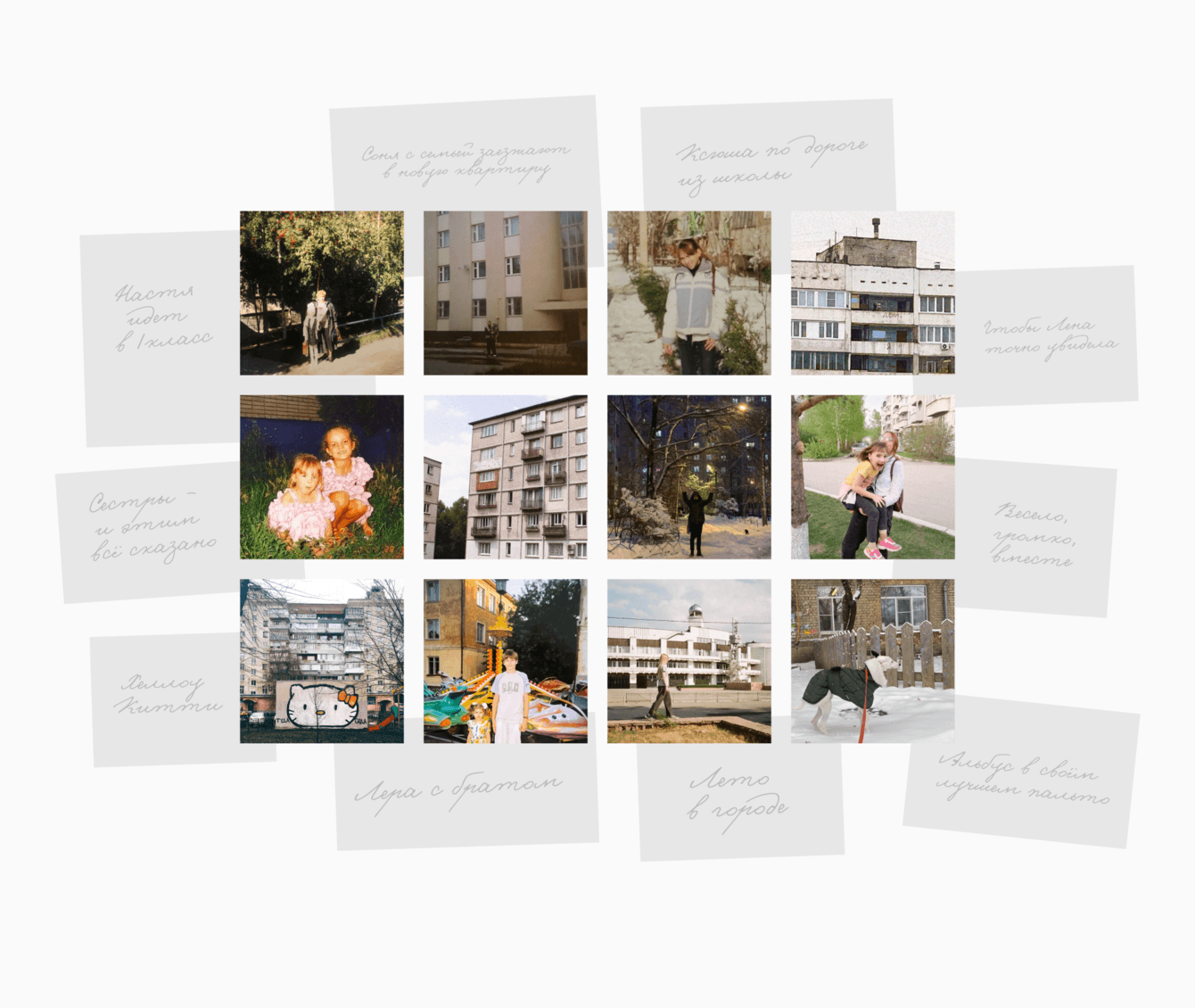 Ещё на этапе тендерного задания предложили идею использовать моментальные фотографии на фоне домов — передать, что типовое жилье занимает большую часть истории любого из нас. Для поиска первой фотографии менеджер проекта Настя Бредихина позвонила маме в другой город и попросила прислать скан своей детской фотографии с первого сентября!