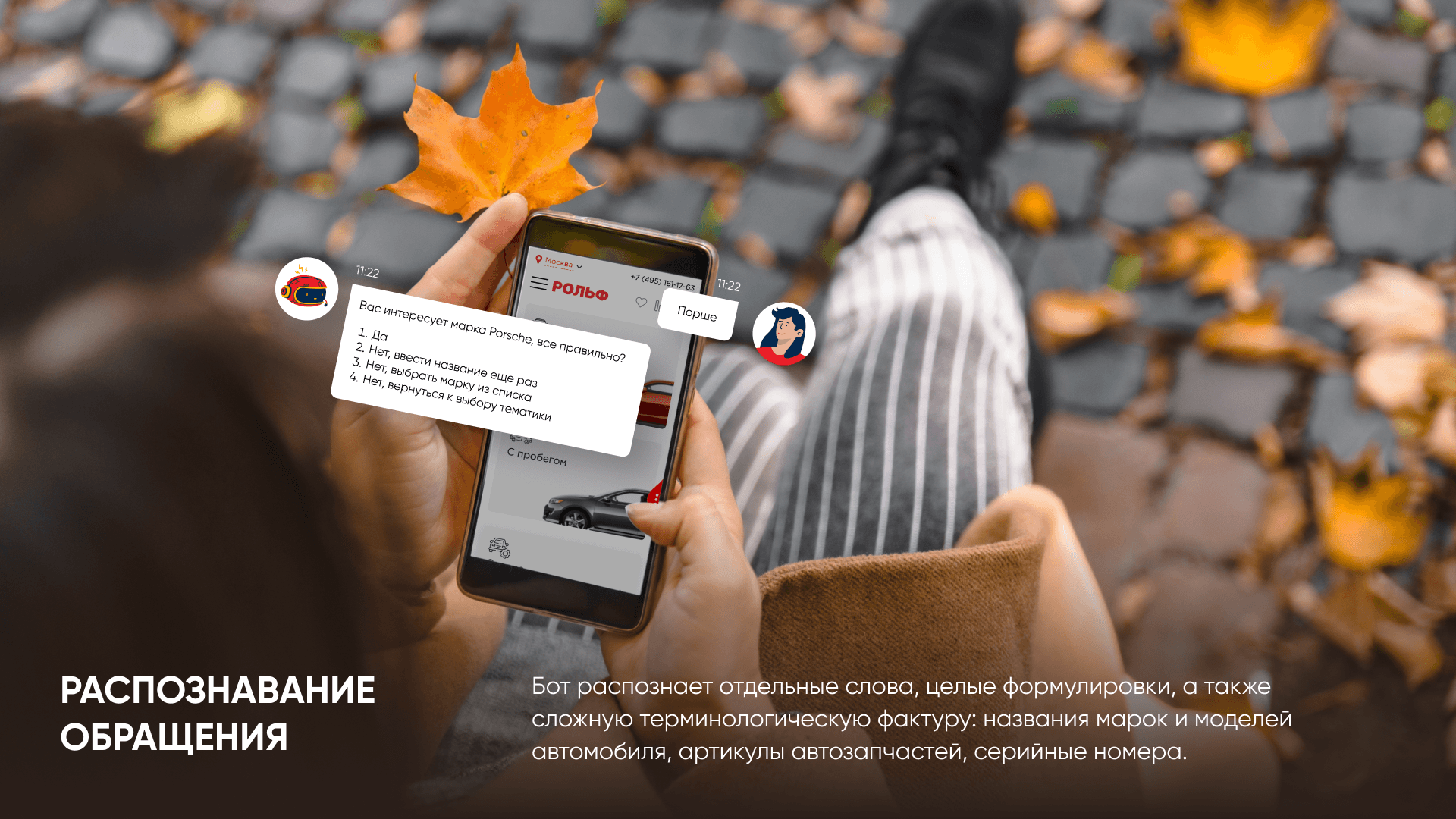 Следующим этапом был уход от «простого» бота к распознаванию запроса пользователя на живом языке, выделяя интенты. Мы научили систему распознавать и квалифицировать целые формулировки, а также сложную терминологическую фактуру (названия марок и моделей автомобиля, артикулы автозапчастей, серийные номера)