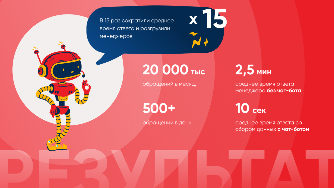 Это сократило в 15 раз среднее время обработки обращения и разгрузило менеджеров (мы можем говорить о 20000 обращений в месяц)