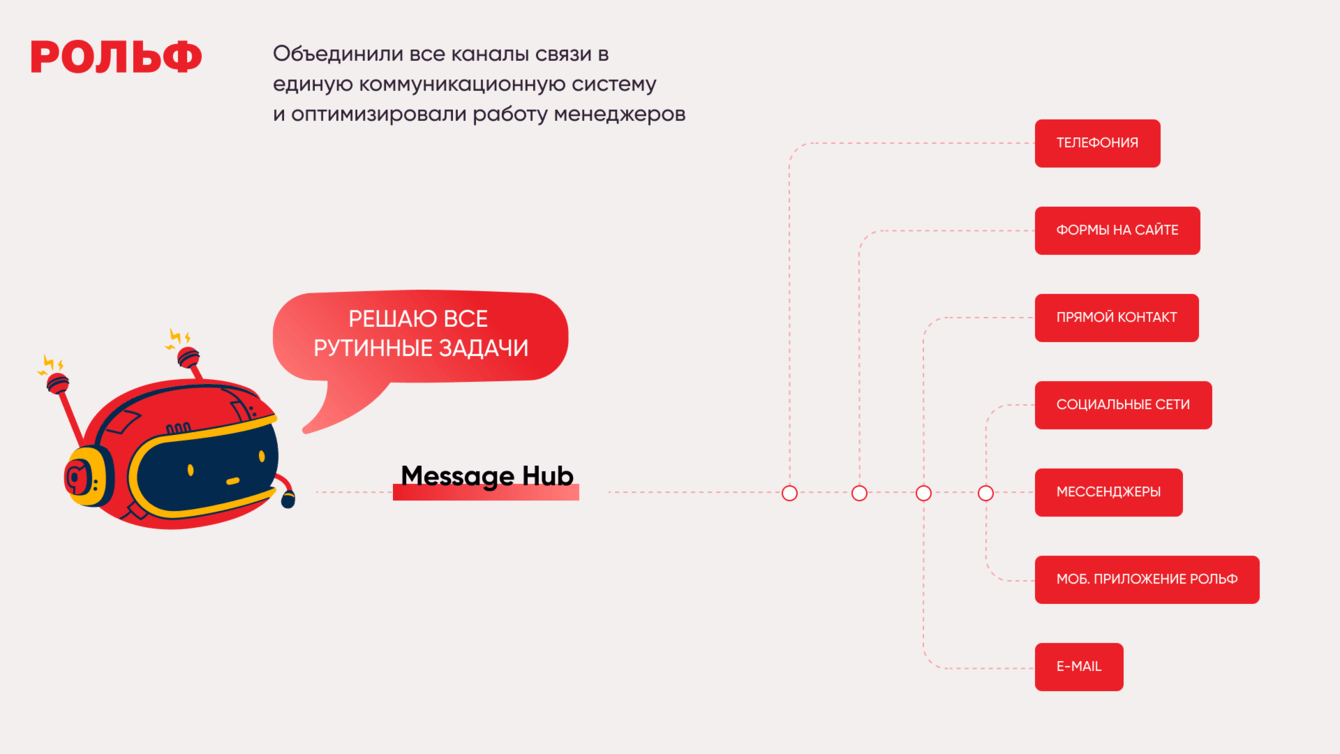 Агрегирование истории обращений b2c-клиентов в месседж-хабе позволяет выявлять самые эффективные команды/сотрудников дилерских центров и операторов колл-центра, анализировать обратную связь конечных клиентов компании РОЛЬФ.
